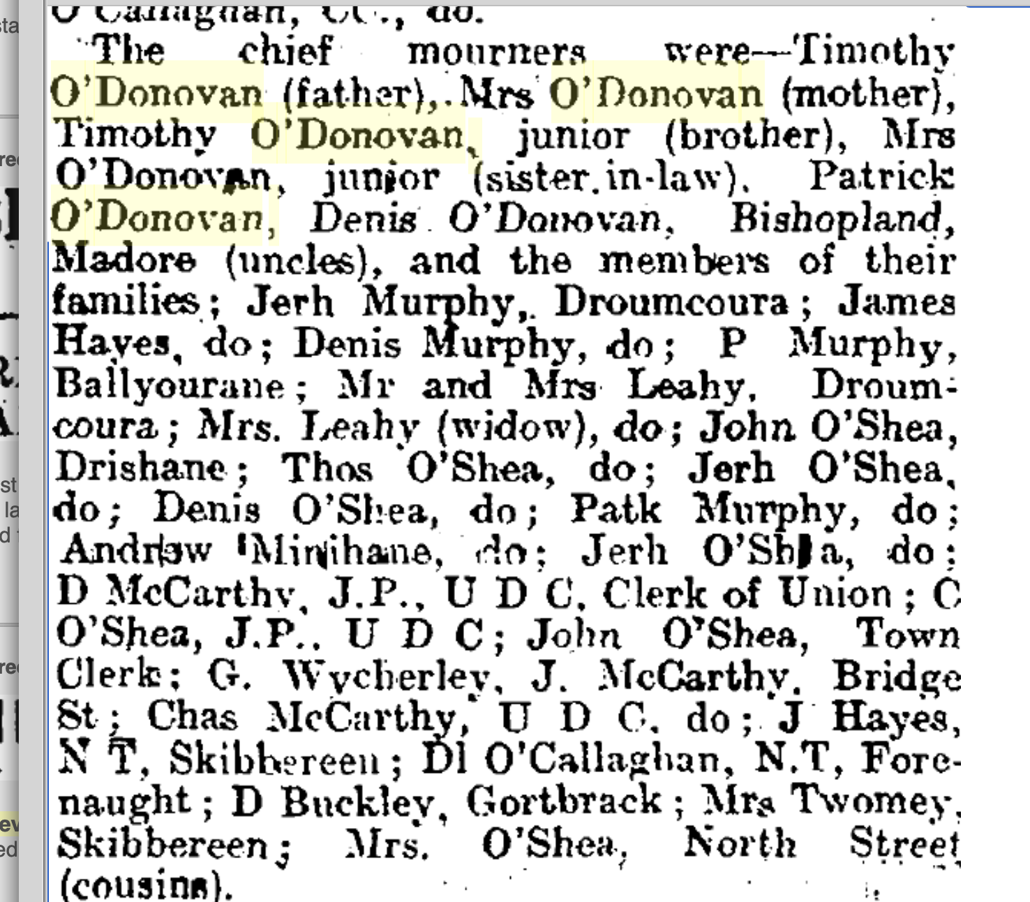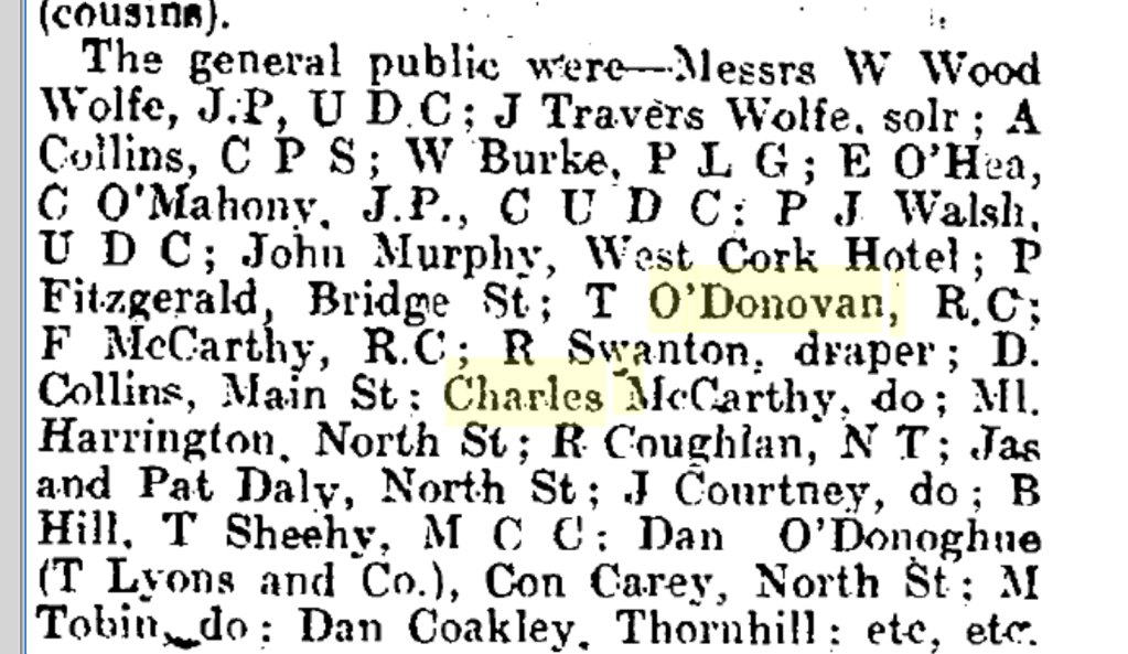 Michael Alleyne Richard Beecher (1839-, 1875, Ballyduvane, Clonakilty, Resident, £130, 1870, 2,101 acres, listed 1916. Landed proprietor, widower 1901. 1884, signed a protest against the dismissal of Lord Rossmore, Head of Orange Order, Monaghan. Sampson T.