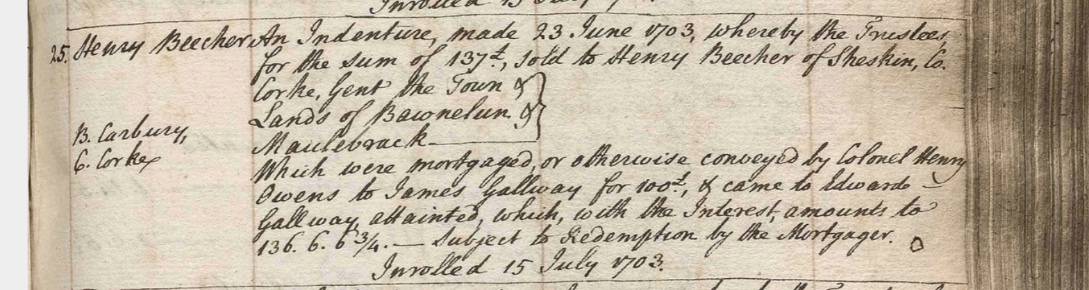 Henry Becher (1664-1738), TCD in 1683 aged 19, son of Thomas Sherkin Island, 1705, witness to 1717 deed with Emanuel Moore. Henry Becher was Thomas Becher’s eldest son. He married Henrietta Owen in 1698. His heir was John Becher. Henry died in 1738.