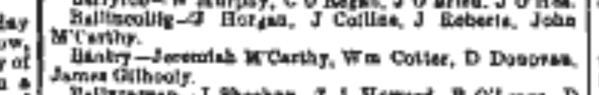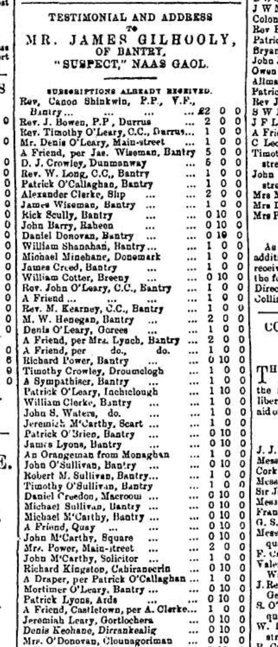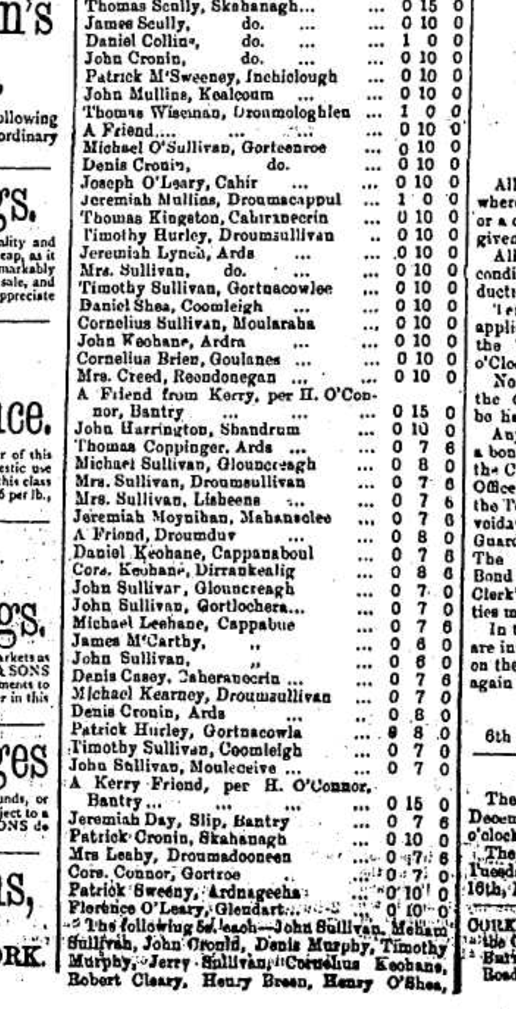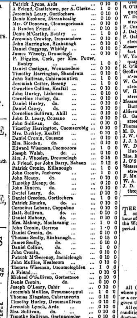 Richard O’Donovan 1818, Fort Lodge, Durrus listed 1838, son Richard Esq. O’Donovan Cove, and Jane d Alexander O’Donovan, Squince. Father of Richard O’Donovan J.P. History Brother of Timothy and Dr. Daniel O’Donovan J.P. He married Maria O’Sullivan on the 15th October 1833Her father was Murty Og, of Ceimatringane House, Castletownbere. She died at Fort Lodge, aged 52. In the summer of 1847, when the Dublin Poor Law Commission published guidelines for the distribution of aid to people outside the workhouse (‘Outdoor Relief ’), the elected Guardians, all with the exception of Richard O’Donovan, vetoed a raise in rates for this purpose. As a result of the Board’s ‘duties not being effectively discharged’, the Poor Law Commission (PLC) dissolved the entire Board in October 1847.20. He voted in 1850 for Denis Galwey as High Constable for Ibane and Ballyroe (Clonakilty). Lease Richard O’Donovan, Magistrate, of Glanlough, Cork Esq. and Francis Lisabe of Ballyshannon, Co. Donegal, civil engineer, of a slate and a flag quarry, and 2 acres of land near the slate quarry in Gouladoo in the parish of Kilcrohane, West Cork, 6th Feb. 1854, Solicitor Desmond, Son-in-Law of John Jagoe, Fishery Commissioner and father of Mother Beninga Townsville, Australia. Member election committee 1865 George Barry Cork, Liberal, County Election Committee. Land record, in Chancery as ‘Donovan’ 1870, 205 acres. Land record, Carrigboy,1870, 193 acres. Member election at Ahakista committee McCarthy Downing, Skibbereen, 1868. 1879 bequest in will of Rickard Donovan, Clerk of the Peace and Crown, Co. Cork, to Mary O’Donovan, of Blackrock near Cork daughter of the late Rickard O’Donovan, of Fort Lodge near Bantry.Timothy O’Donovan (1790-1874), 1818, O’Donovan’s Cove, in ruins 1875, Durrus, listed 1823, son of Richard Esq. and Jane d Alexander O’Donovan, Squince. 1820. Memorial to Lord Lieutenant William Swanton, Gortnagrough, Ballydehob, West Cork. High Constable (Rate and Tax Collector), Barony of West Carbery For Relief on Losses Caused to Him in Banking Collapse when He had transmitted Due Amount to Co. Treasurer, Leslies, Stephen and Roches Bank, Supported by Lord Bantry and Magistrates Timothy O’Donovan (Durrus), William Hull (Schull), Richard Townsend (Skibbereen), Rev. Edward Jones Alcock (Durrus), Nathaniel Evanson (Durrus), Robert Kenny (Bantry). In 1823 he applied for relief of the poor of Ballydehob, which he had founded. Present at enquiry Skibbereen 1823 into enquiry into fatal affray at Castlehaven caused by Rev. Morritt’s tithe extraction. Correspondent with Antiquarian Dr. John O’Donovan re O’Donovans of Carbery. Brother of Dr O’Donovan and Richard O’Donovan J.P. and uncle of Richard O’Donovan J.P.. His son’s wife is the granddaughter of Daniel O’Connell, the mother of his wife was Miss Lavellan, Co. Limerick, a daughter of Philip Lavellin of Water Park, Carrigaline. in the Co. of Cork. Her sister was married to Mr. Puxley of Dunboy Branch. The grandson the present (1860) Mr. Puxley is a man of immense wealth and the principal owner of the famous Allihies Mines in the Barony of Bere. Signed public declaration in Skibbereen to Alexander O’Driscoll on his removal as Magistrate 1835 with Lord Bantry, Simon White, John Puxley, Arthur Hutchins, Thomas Baldwin, Samuel Townsend Junior and Senior, Thomas Somerville, Richard Townsend Senior, Rev. Alleyn Evanson, Richard Townsend, Lyttleton Lyster. 1835 Subscriber Lewis Topographical Dictionary of Ireland 1837. In 1838 in the Liberal interest where at Bantry voter registration 15 were registered as opposed to 6 ‘Orangemen’ the tenants of Timothy O’Donovan J.P. were chiefly among those who registered. Among these were probably McCarthys of Tulig later prominent in Nationalist politics of whom John McCarthy (1859-1931) became a leading politician in Nebraska and wrote a poem in praise of Timothy O’Donovan. Attended Great Meeting in Bantry 1840 re Poor Laws. Chaired 1846 distress meeting Bantry on the proposition of Father Michael Barry PP Bantry. Landlord and political organiser. Member Election Committee, Rickard Deasy, Clonakilty (later Attorney General) 1855 Member election committee McCarthy Downing, Skibbereen. 1857 Vice Chairman of Bantry Union. Juror Cork Spring Assizes 1863. Member election committee 1865 George Barry Cork, Liberal, County Election Committee. Land record, 1870, Kate O’Donovan, O’Donovan’s Cove, 1,940 acres and Reps Timothy O’Donovan 1,940 acres. 1874, Death at 85 of Timothy O’Donovan, J.P., Esq, O’Donovan Cove, Durrus, West Cork, The Last Survivor of the Ancient House of O’Donovan Bawn or Clann Cahill, Justice of the Peace since 1818 Probate to daughter Mrs Anne Barry, widow, effects £2,000, attended 8, Grand Jury Presentments