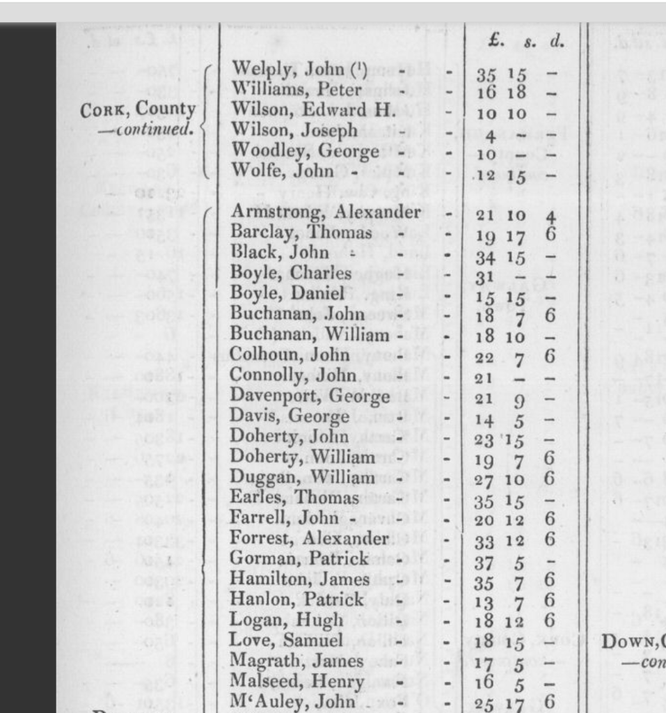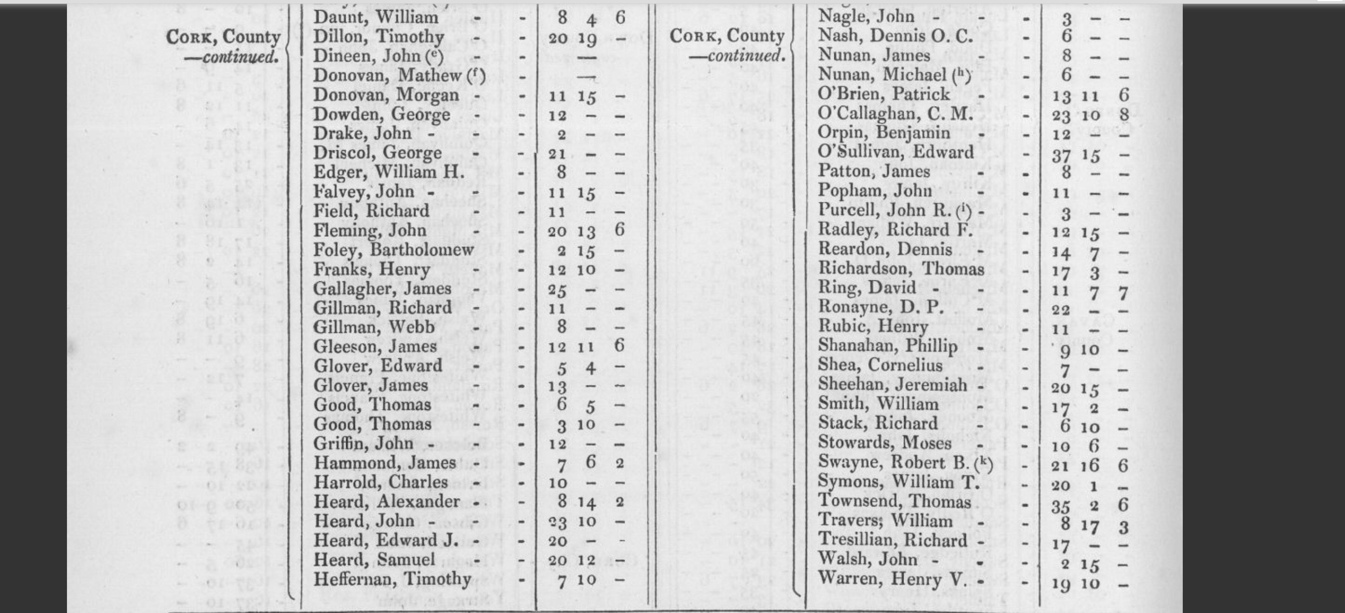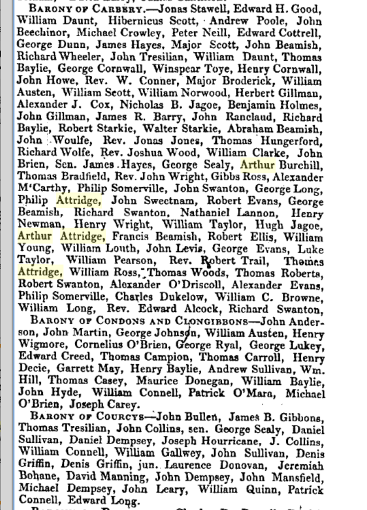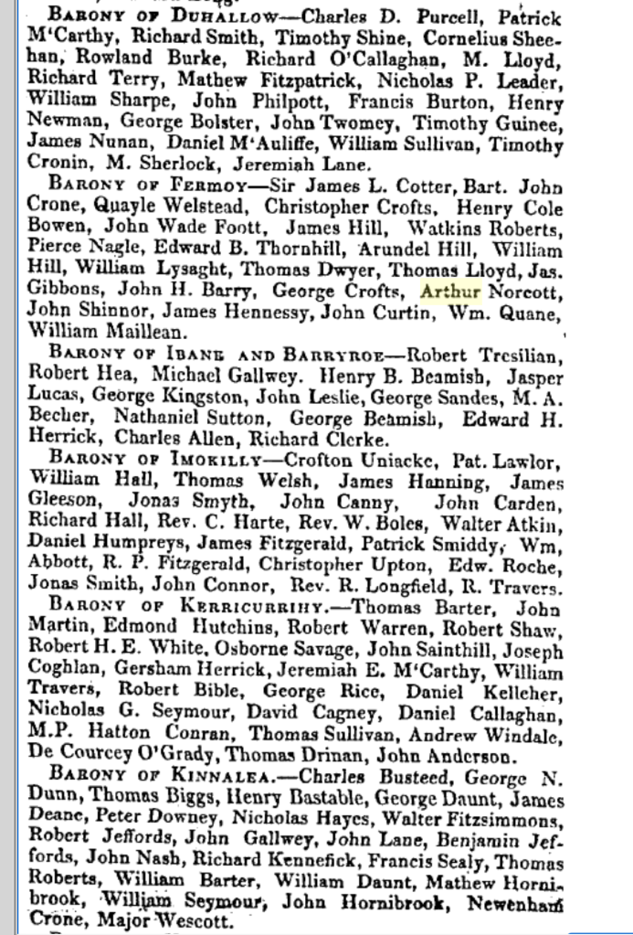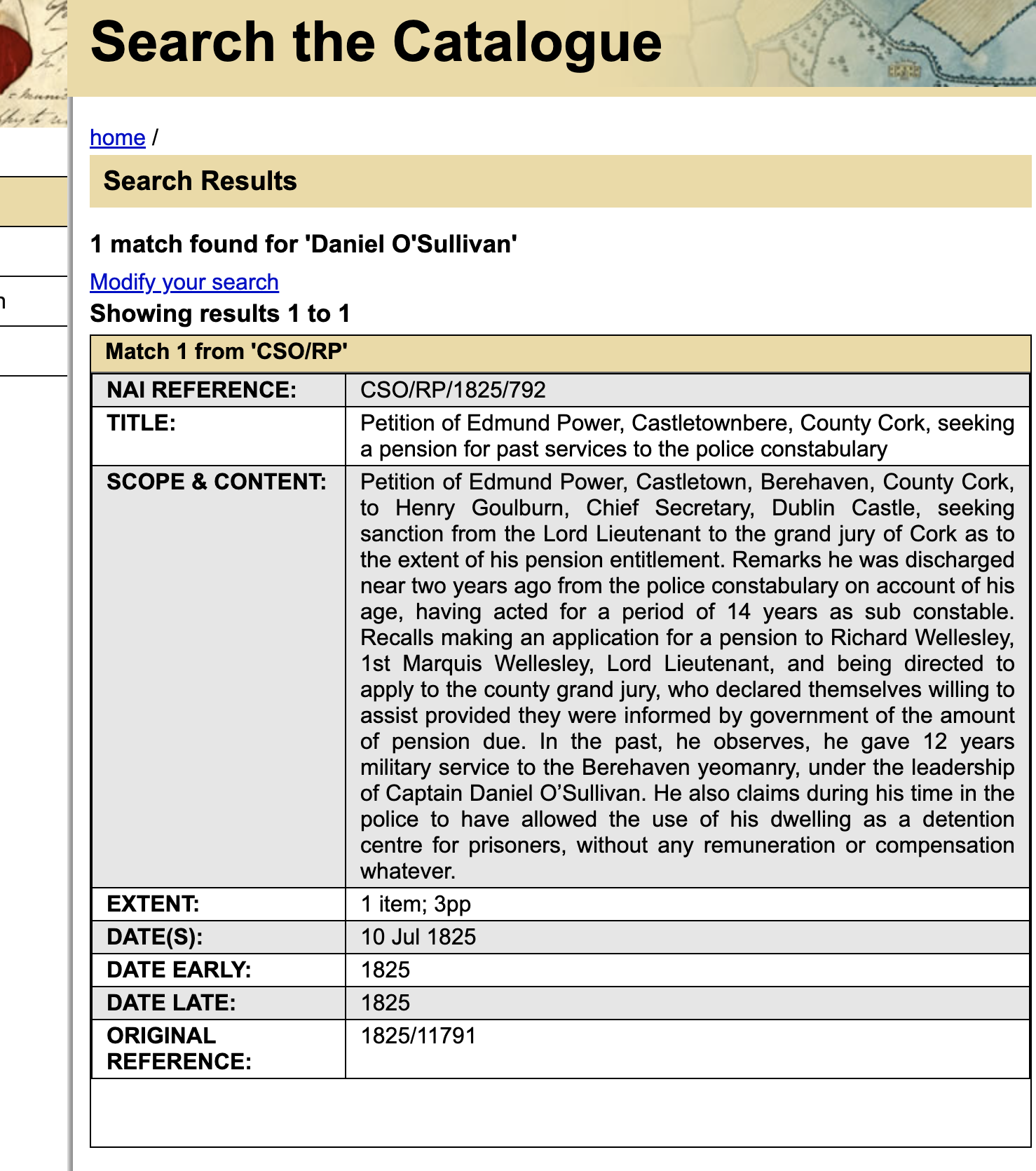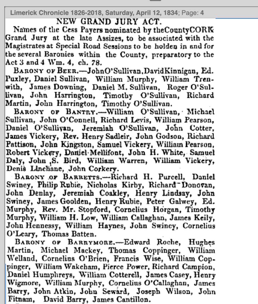 1822, 1823, 1830, 1837 John Sweetnam Last Seneschal Aughadown and Schull Manors, later president of te Court of Justice before presumably Resident Magistrates Daughter Frances Gertude married William Clerke (1766-1820) possibly Skibbereen Mills. 1824. Letter from John Sweetman, seneschal of manor court of Bridgestown, Skibbereen, County Cork, to Chief Secretary’s Office, Dublin Castle, acknowledging directive for removal of four prisoners to the county gaol and communicating discomfort at prospect of releasing two debtors for fear of being sued for debts owed by the men; includes memorial from Swicham to Henry Goulburn, Chief Secretary, Dublin Castle, requesting clarification on application of a recent prison act to manor courts, especially as it relates to prisoners ‘confined for any sum not Exceeding ten pounds’, with response to same from John Sealy Townsend, KC and legal advisor to Chief Secretary’s Office, Dublin Castle. Died February 1824 at Mardyke House, Skibbereen. Ffolliott 1823. Letter from William Hull, Lemcon, Skibbereen, County Cork, to Henry Goulburn, Chief Secretary, Dublin Castle, referring to his former letter, emphasising the need to provide a simpler and less expensive means for the lower classes to recover small debts owed to them. Encloses, in support of his claim, a document entitled ‘ “a Manor Court Decree” taken by Richard Connell against Edward Butler, both of Kealfada, County Cork, demonstrating that the legal costs far outstrip the amount of the original debt; decree originally signed by John Sweetnam, seneschal [of Aghadown and Schull Manors], 4 October 1823. .