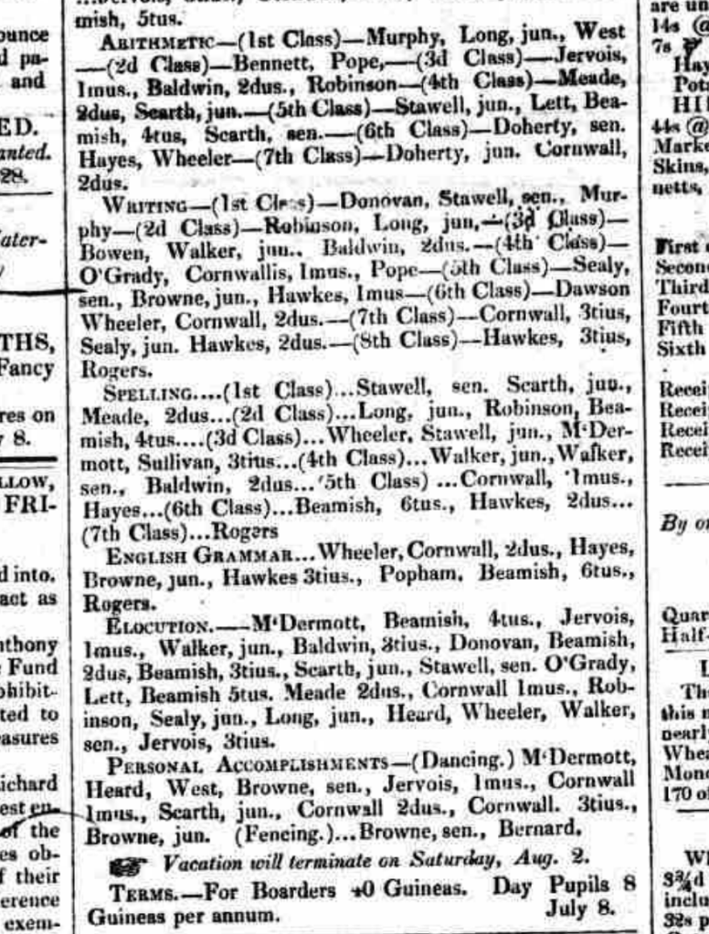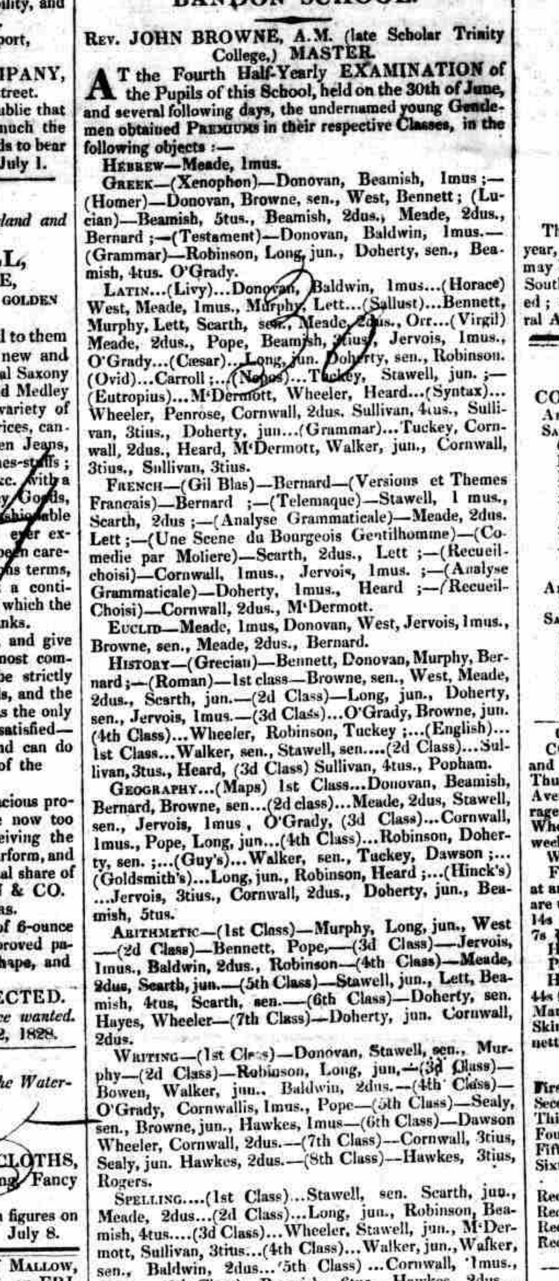 1828. School Results, Bandon Grammar School, Headmaster Dr. John Browne. 01 Sunday Feb 2026 Posted by durrushistory in Uncategorized ≈ Leave a comment 1828 Probably TCD entry BROWNE John 1814 16 James Calcearius Co. Roscommon Headmaster of Kilkenny College