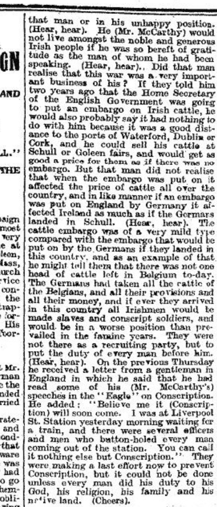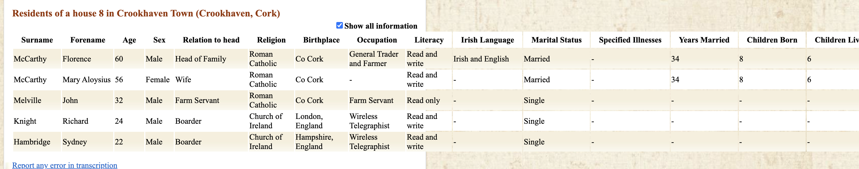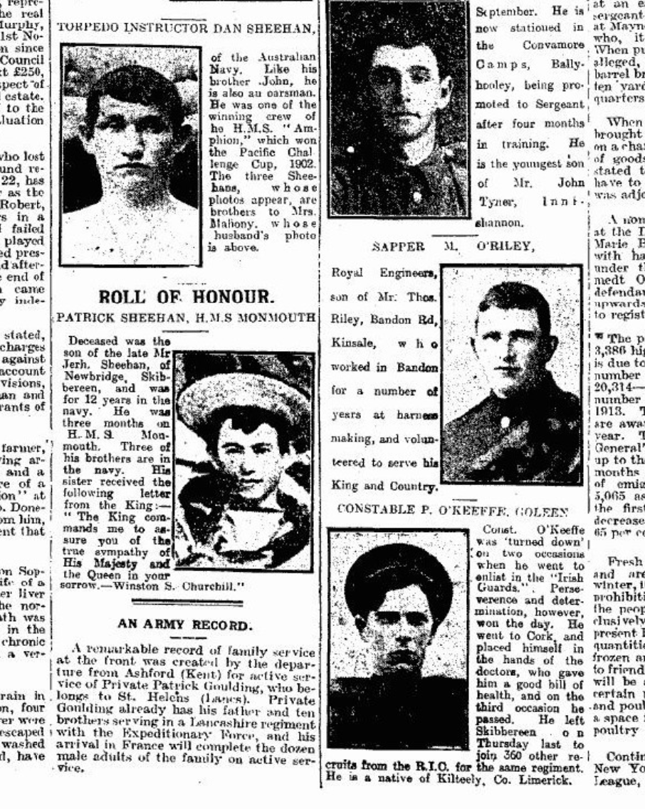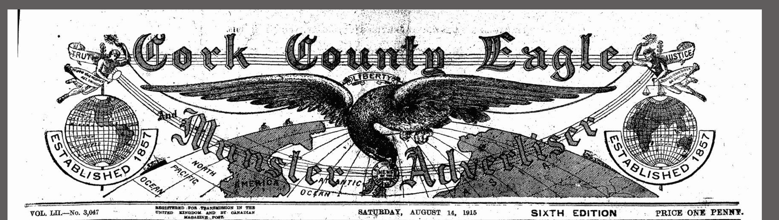 Native Skibbereen:Returning officer west Cork constituency elcction agent James Gilhooley MP. 1906 consortium Richard Wheeler Doherty, Solicitor, Bandon, John Walsh, businessman, director Allmans Distillery, Bandon, Hugo Flinn, Fish buyer, Cork, Jasper Travers Woulfe, solicitor, Skibbereen, took over Skibbereen Eagle on death of previous owner. Funeral of 1897, Michael O’Driscoll, Castlehaven South buried Baltimore. Committee member 1902 member Baltimore regatta.