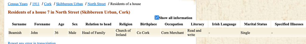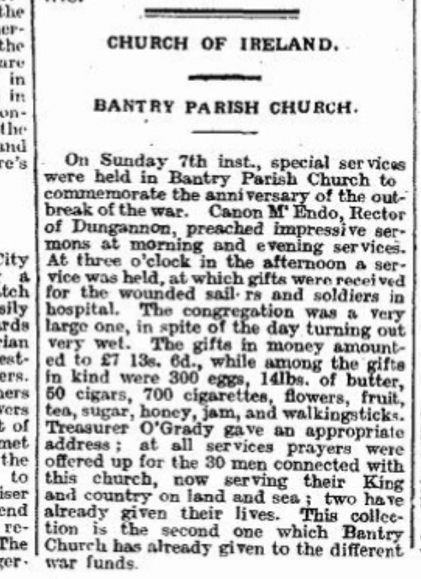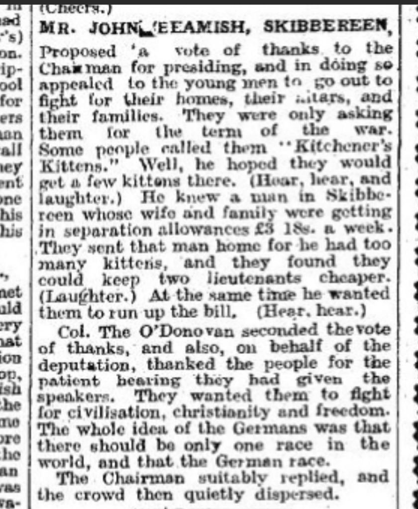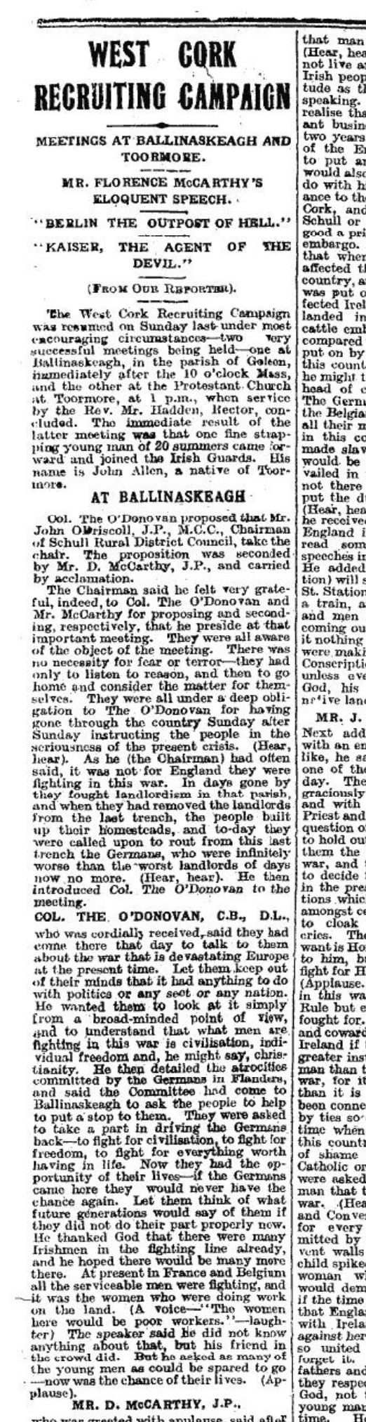Colonel Morgan William ‘The O’Donovan’ Oxon (1861-1940), CB, D.L., MA, 1888, ‘The O’Donovan’, Clann Cathal, Lis Árd, Skibbereen, son of Henry Winthrop ‘The O’Donovan’ MA, DL. and Amelia d ‘The O’Grady’, Courcy O’Grady, Kilballyowen, Co. Limerick. Ed. Haileybury and Oxford, Lieutenant-Colonel Munster Fusiliers, Colonel South Cork Militia Boer War,. In attendance at the 1888 The Freemasons Ball was held in Cork in aid of Freemason’s charities, over the platform a large Union Jack Flag, together with the Prince of Wales plumes and motto. Funeral 1890 John Island Donovan, (of the Island Sept, Rosscarbery), M.D., North St. Skibbereen, Ullagóne (Keeners). 1890 Skibbereen Quarter Sessions sitting with Circuit Court Judge Ferguson on Schull licensing appeal cases. Magistrates, John K?. Barrett, William Murphy, M.P., George Robinson, Somers. H. Payne, W .S. Payne, Henry R. Marmion, Samuel Jagoe, O’Donovan, John R. H. Becher, William Norwood, Carew O’Grady. 1892 two of his heifers at Lissard put down suffering from rabies. Attending the 1894 funeral of George Robinson, Landlords and Magistrate. Succeeded Colonel Aylmer C. Somerville 1899 as President Carbery Agricultural Society. Member Cork Defence Union 1885, one of whose aims was to ‘Resist the tyranny by a body calling themselves the Irish National League”. Presented organ to Creagh Church to commemorate the Jubilee of Queen Victoria. 1892 High Sheriff, Co.Cork ill, spent the summer on the Continent recovering. 1893 Member Cork Historical and Archaeological Society. Member Royal Society of Antiquaries 1889. Sent a carriage to the funeral of Lieutenant-Colonel Thomas Somerville D.L. (1824-1898), Clontaff, Drishane. 1902 member committee Baltimore Regatta. Subscriber West Carbery ploughing match 1904. Signed Requisition 1905. Cork Junction Railway Bill. Requisition to the Right Honourable The Earl of Bandon K.P., to Call a meeting for the purpose of Approving the Cork Junctions Railway Bill. Addressing a recruitment meeting in Drimoleague In July 1915 he referred to this ancient stronghold (Castle Donovan) of his family. After they displaced the O’Driscolls they became the Chief People of the Carberies. Listed family members as giving a present to 1907 Spaight wedding Union Hall. Considered the preservation of ancient documents a matter of importance. M Mary Eleanor, (Madame) odo Rev. J Yarker Barton, Chaplain to British Forces, she chaired the Women’s Emergency Recruiting Committee WW1, Skibbereen, listed 1921. Attending 10 Grand Jury presentments. 1915 fund to aid Polish soldiers WW1. Member Board Baltimore and Skibbereen Harbour Board. 1933 writing to Carbery Agricultural Society suggesting horticultural potential in West Cork.