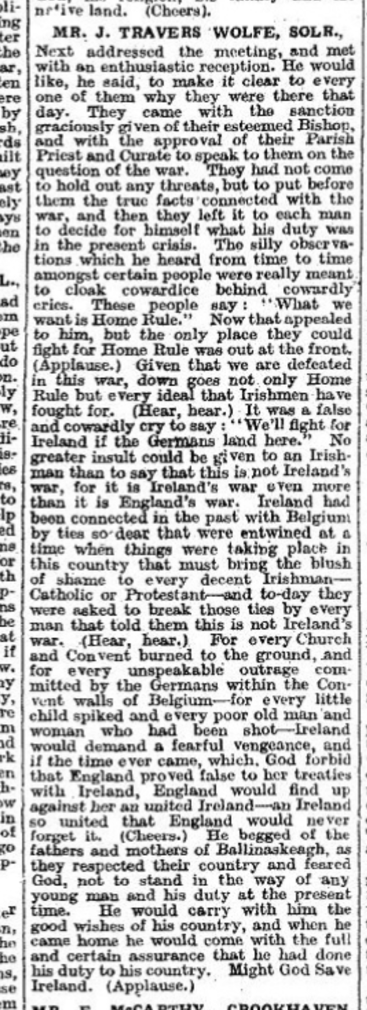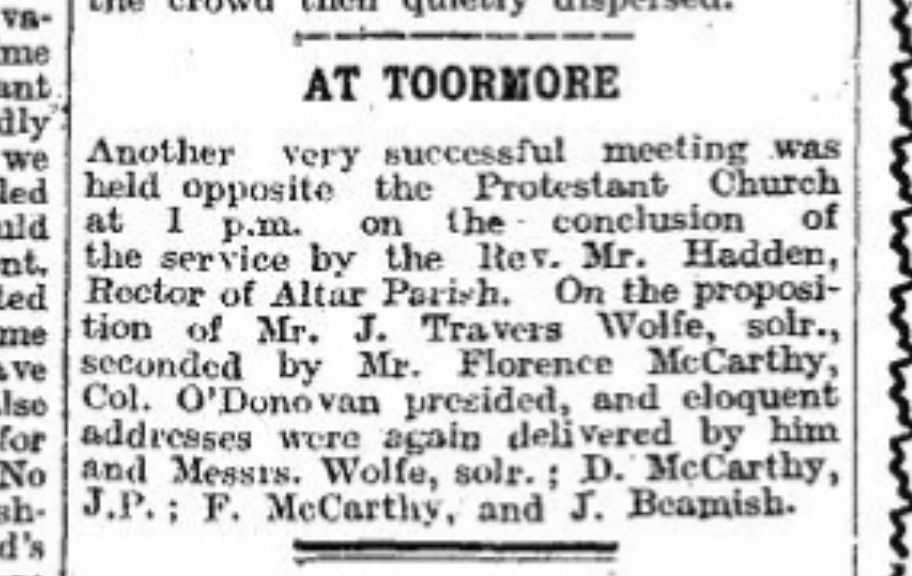 1884, 1917 Jasper Travers Wolfe Solicitor, Crown Solicitor, TD “Norton, Skibbereen, 1st place Law Society Final Exam, Director Skibbereen Eagle member Governing Body, UCC. subscriber Zenith Marine Disaster, Baltimore, 1895. 1895 Funeral and wreath of Bantry Solicitor Daniel O’Donovan aged 26. 1897 attending the funeral of Father Michael Kearney, Parish Priest, Durrus in Kilcrohane.