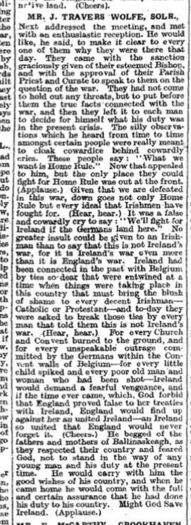 Funeral attending 1920 June 1920 the Black adn Tans/RIC murderd Connie Crowley a 2 year oldcripple and burned bususness premises, he went to Banatry to try an calm matters Edward Ederton Leigh White, died age 44 Bantry House. Fled to Enhland after IRAthreats April 1922 returned months later. Later received £3,00 from a calim of £7,670 for injuly to is business adn loss of income from the loss of his office for IGC. Letter to Eoin O’Mahony from Jasper Travers Wolfe, solicitor, Skibbereen, Co. Cork, regarding the Dail motion to remove Judge Edward McElligott from office, 1941 May 5. 1932, attending funeral of Michael Harrington, Merchant, Skibbereen