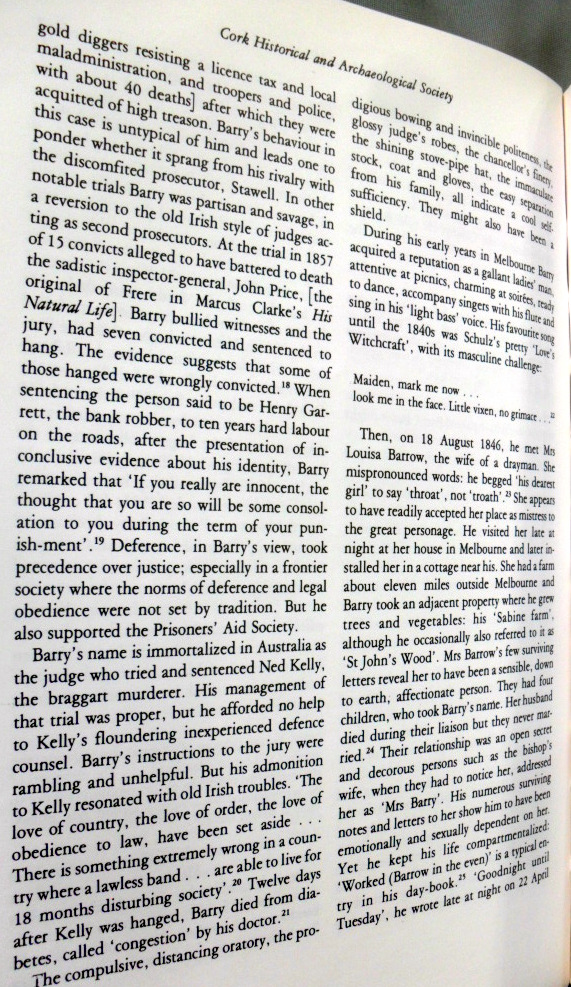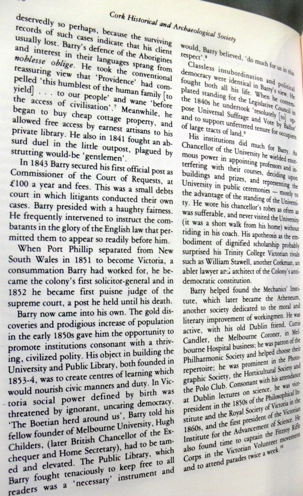 Sir Redmond Barry, Supreme Court Judge, Melbourne, Australia, Judge in Ned Kelly case, Involved in founding University of Melbourne, Art Gallery, Mechanics Institute, Schools of Mines, cultural Societies, Born Ballycough Co. Cork, 1813 died Melbourne 1889. The Redmond Barry Building is a significant building at the University of Melbourne.