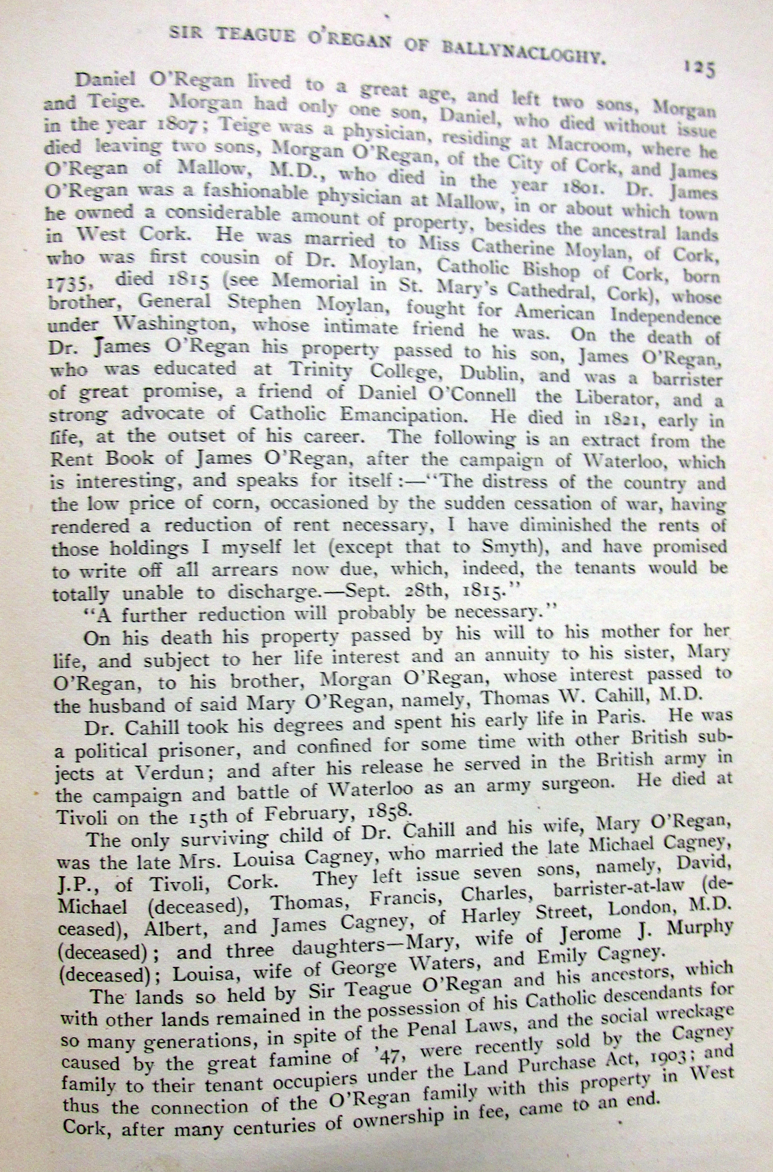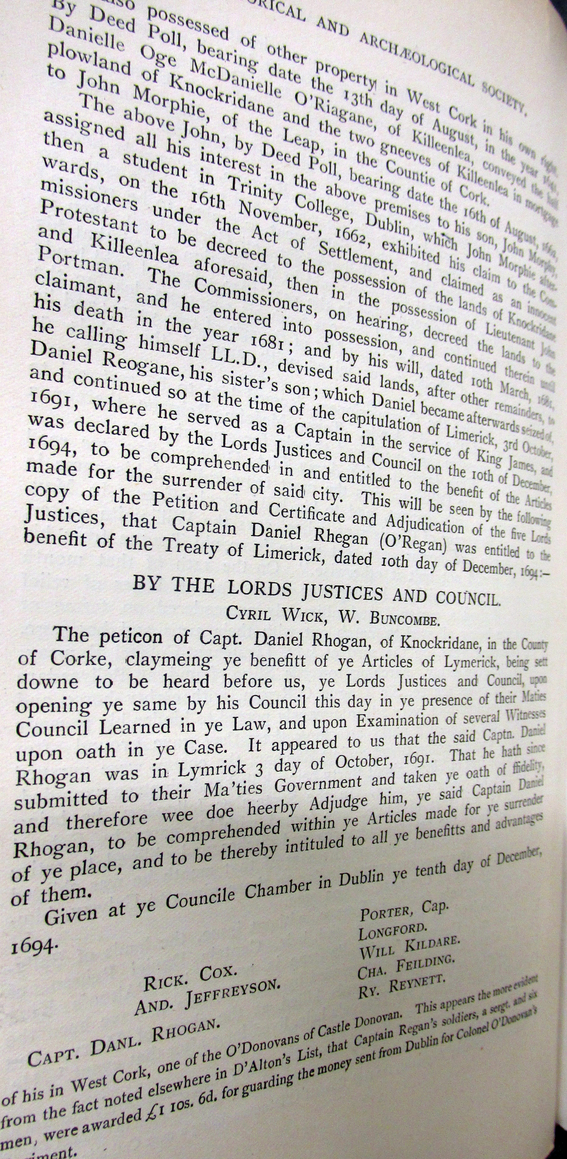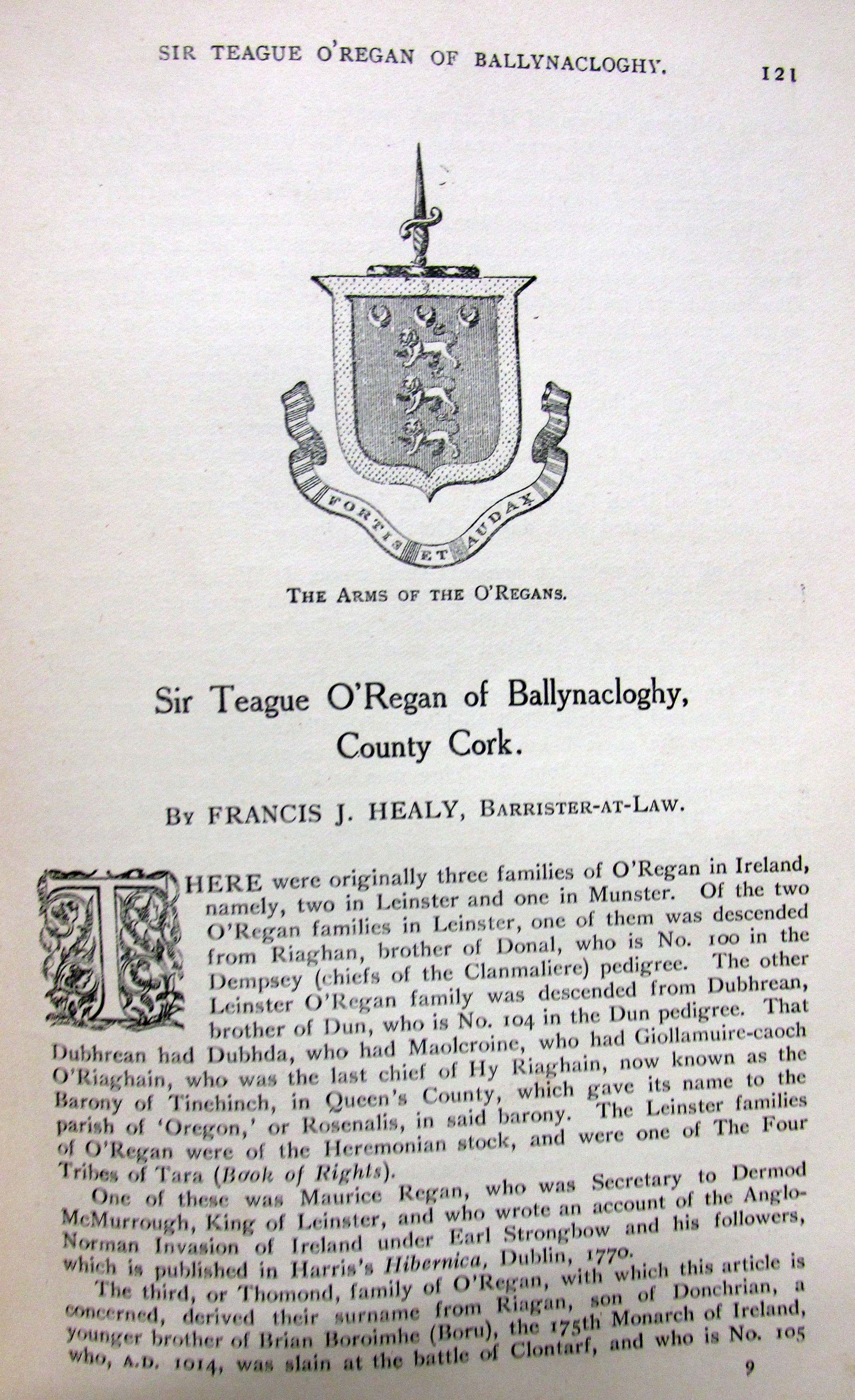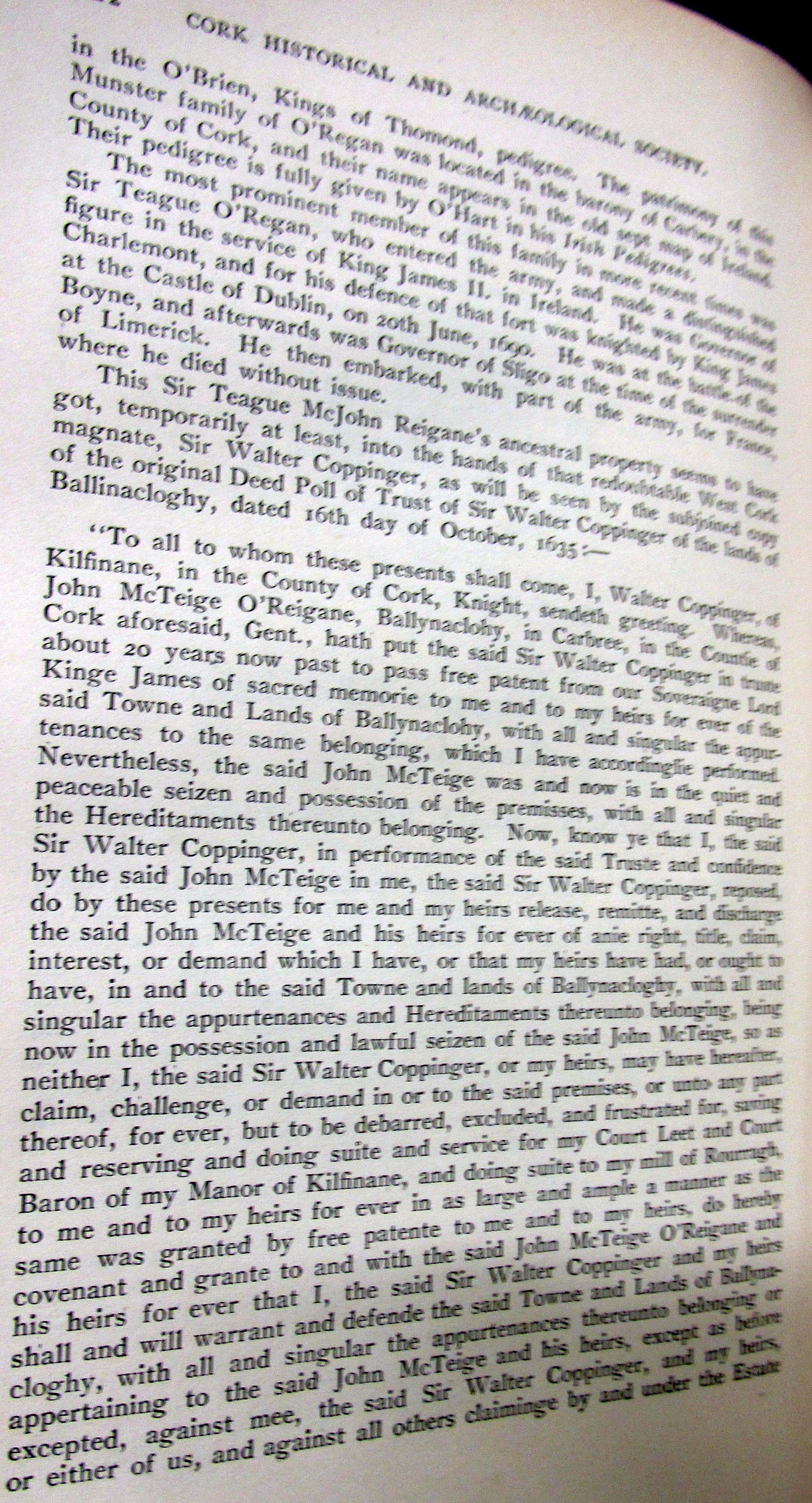 Early Genealogy of Sir Teague O’Regan of Balltnaclohy and Gortniglogh, Killeenlea, near Leap, Carbery West Cork, Temporary holding of lands from 1615 by Sir Walter Coppinger, loss by forfeiture and subsequent restoration under Articles of Treaty of Limerick 1690, later family including fashionable Dr. O’Regan of Mallow and Legal Luminaries, friend of Daniel O’Connell.  Estates finally sold by descendants Cork Cagney family early 20th century to tenants.