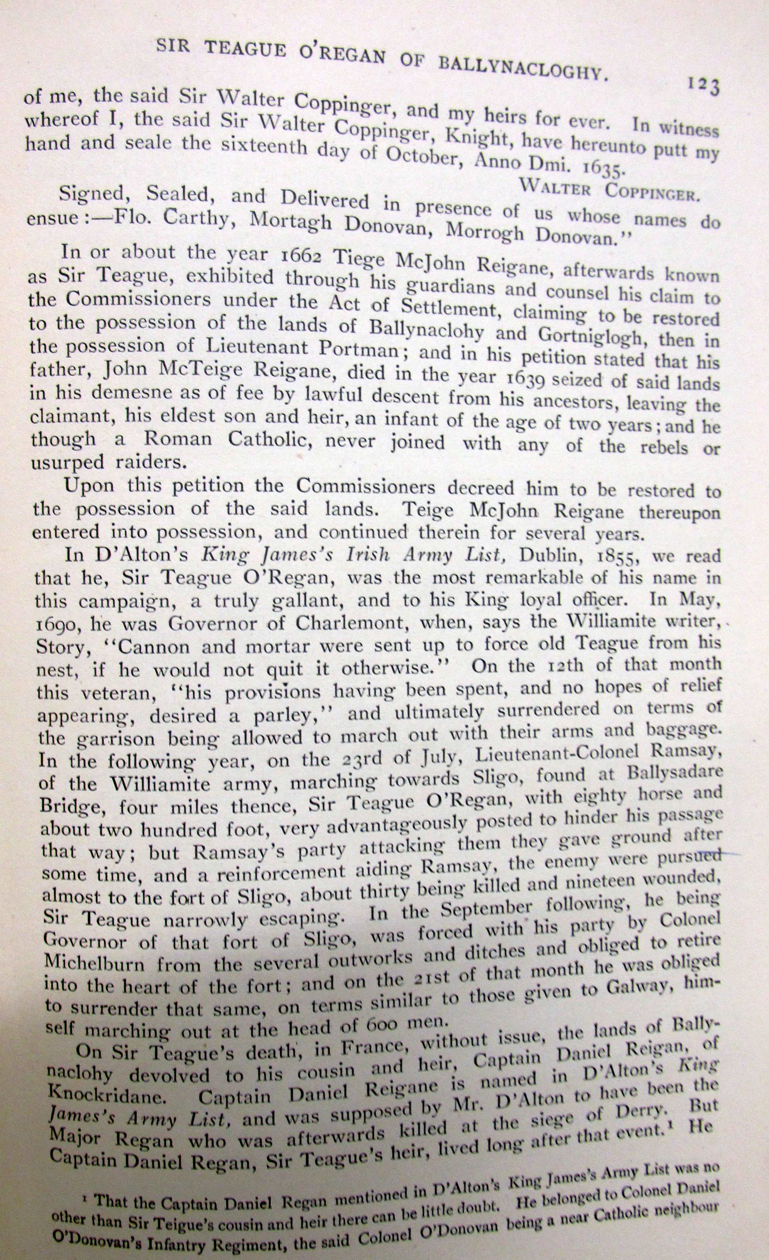 Early Genealogy of Sir Teague O’Regan of Balltnaclohy and Gortniglogh, Killeenlea, near Leap, Carbery West Cork, Temporary holding of lands from 1615 by Sir Walter Coppinger, loss by forfeiture and subsequent restoration under Articles of Treaty of Limerick 1690, later family including fashionable Dr.O’Regan of Mallow, Jaes O’Regan, Barrister, Confidant of Daniel O’Connell. Estates finally sold by descendants Cagney family early 20th century to tenants.