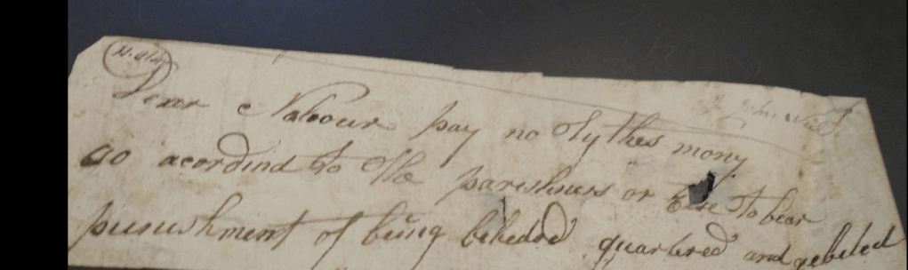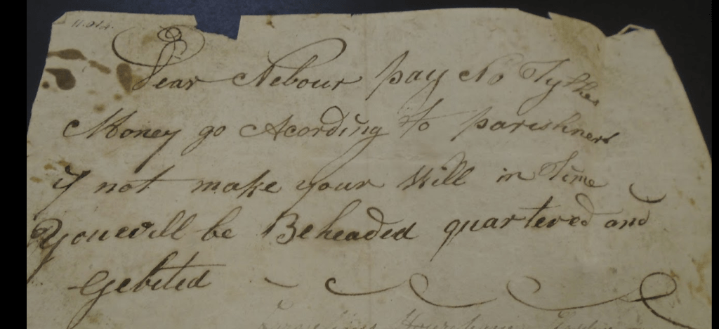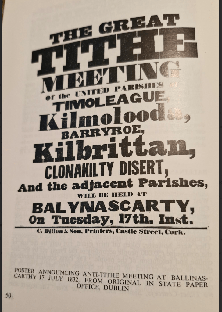 1832, Drimoleague, Anti Tithe Notice Posted ‘Dear Nebour Pay No Tythe Money Go According to Pereshners if Not Make Your Will or You be Beheaded Quartered and Gelded’