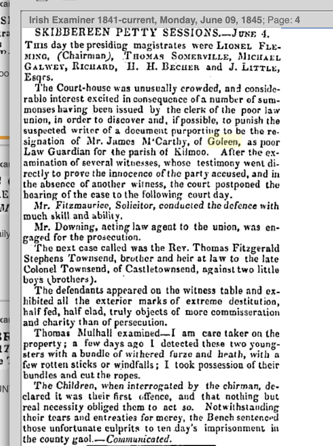 1845 Skibbereen Petty Sessions., 2 Starving Little Brothers. Half Fed Half Clad. Sentenced to 10 Days Imprisonment in Cork County Gaol for Having a Few Bundles of Withered Furze and a Few Rotten Sticks At the Prosecution of the Rev. Thomas Fitzgerald Stephens Townsend Brother and Heir at Law Of The late Colonel John Townsend, Castletownshend