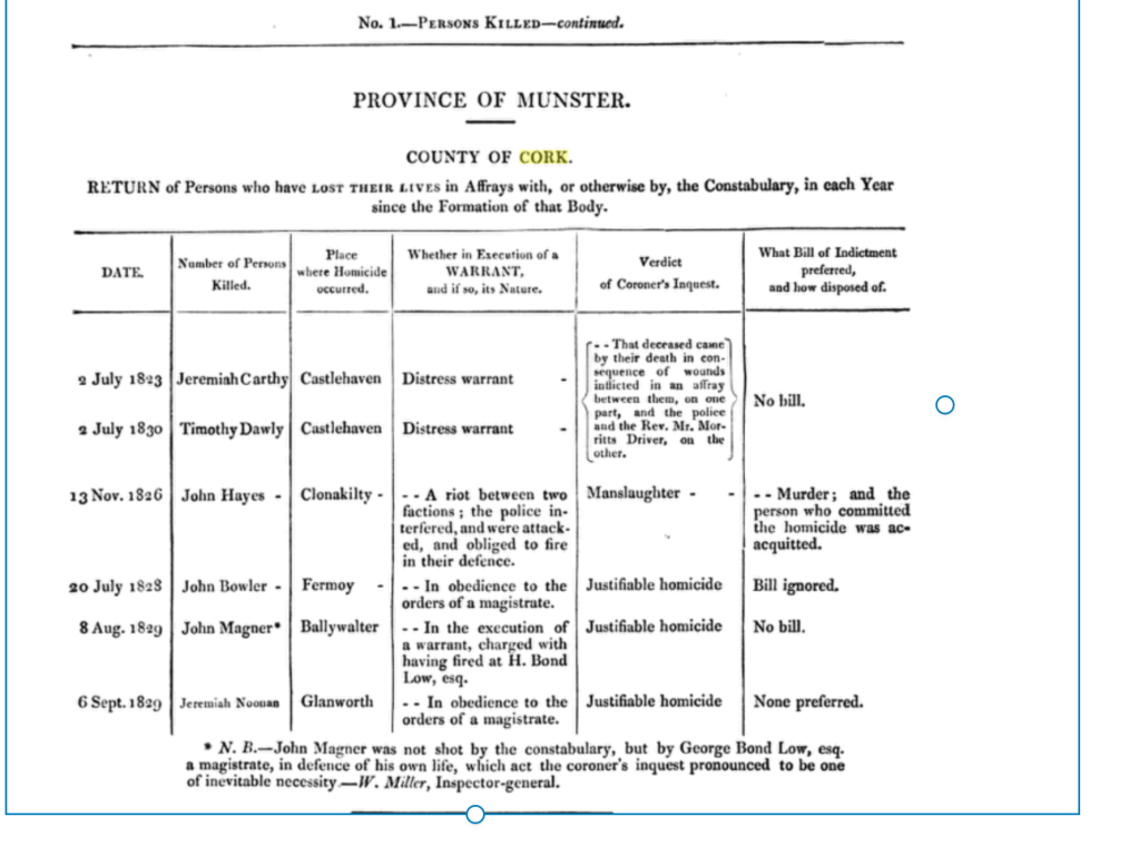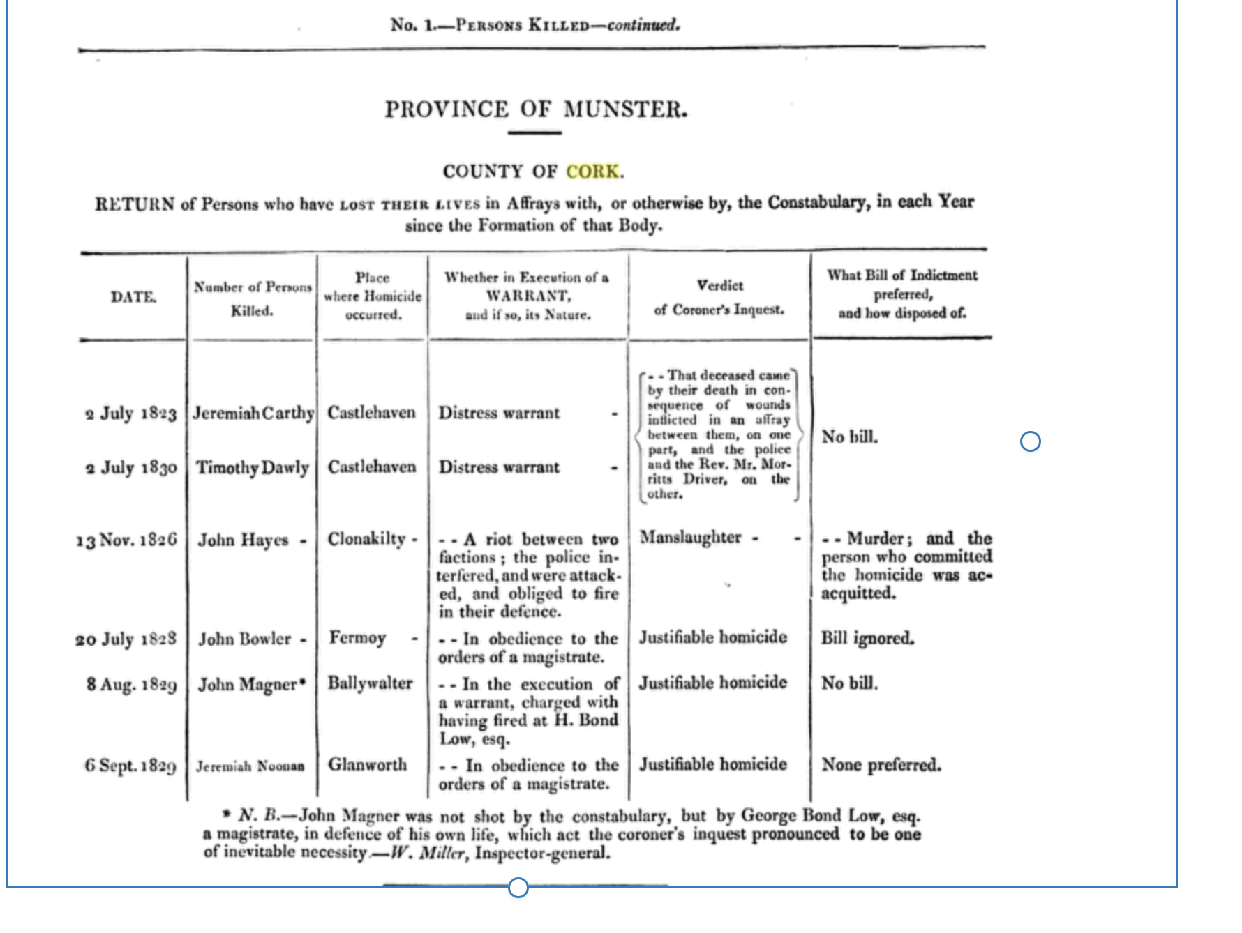 Captain Alexander O’Driscoll, 1827, Clover Hill, Superseded 1810-30, Restored 1843. Norton Cottage, Skibbereen (two of the same name at time), Ancestor Alexander married daughter of McFineen Dubh O’Sullivan, son of Tim ‘The Gauger’, sister Mrs Freke of Baltimore Castle. 1820 signed Memorial for new road Glengariff to Castletownbere. Married to the daughter of Thomas Attridge, Ballydehob. Correspondence with Chief Secretary appealing dismissal of 1820. Bridge at Bawnlahan 1820. 1822 subscriber as Clover Hill, Church Building Fund Durrus, he held tithes in Kilcrohane with Rector and Rev. Alleyn Evanson. Present at enquiry Skibbereen 1823 into enquiry into fatal affray at Castlehaven caused by Rev. Morritt’s tithe extraction. Grand Jury Presentments attending 12 from 1838-1840 at Norton Cottage. Probably engaged with his crew in marine salvage of Clio out of Crookhaven 1825. 1826 City election voted O’Callaghan conservative. Voted 1835 election as out of town Freeman address Shepperton. Public support for him on dismissal 1835 by fellow Magistrates Lord Bantry, Simon White, John Puxley, Samuel Townsend Senior, Samuel Townsend Junior, Hugh Lawton, Thomas Somerville, Rev. Alleyn Evanson, Richard Townsend Senior. Enquiry attended in Bandon 1841 into suspension arising from conduct with Stipendiary Magistrate J. Gore Jones and Sub-Inspector Andrew Creagh attended Earl of Bandon, Lord Viscount Bernard, on. H. White Hedges, Macroom Castle, Henry Bernard, Castle Barnard, Abraham Morris Dunkettle, Captain Henry Wallis, Drishane Castle, Lieutenant Colonel St. John Clerke, Overton House, William Cooke Wallis Junior, Castlecook, Mathias Hendley, Mountrivers, Henry Leader, Mount Leader, George Browne, Coolcower, St. Ledger Aldworth, Newmarket, Charles Evanson, Carlemont, Cork, Sir Thomas Deane, Thomas Hungerford, The Island, Nicholas Dunscomb, Mount Desert, Richard Henry Hedges Becher, Hollybrook, Skibbereen, John Isaac Heard, Kinsale, John Wheeler, Junior, James Gillman, Retreat, MD, Clonakilty, Thomas Herrick, Coolkerry, Captain R.A. Rogers, Petersfield, Michael Gallway, Gurtnagreena, John Nason, G. Nagle, Ballinamona Castle, Samuel Wallis Goold Adams, Jamesbrook, Jeremiah E. McCarthy, Rathduane, William F. Austen, Greenshela, Thomas R. Sarsfield, Ducloyne, Arthur Pery Aylmer, Castlefreke, Thomas Cuthbert Kearney, Garretstown, Joseph Haynes, Maryland House, Charles Connell, Cloverhill, John Barter, Cooldaniel, Francis G. Woodley, Leeds, Lawrence Corban, Maryville, E. Millett, MD, Cove. 1841 supported Conservative Longfield Longueville, Mallow even though Catholic hosted meeting attending John Ross, Rossford, Thomas Morris, Mahonagh, Thomas Wood, Dereeny, Listed 1838, dead….. with address Mount Music/Bunaulin, Caheragh when daughter Kate married Herbert Baldwin Esq., 1845. 1835 Subscriber at Gortnascrena, Skibbereen, Lewis Topographical Dictionary of Ireland 1837. Suspended for a period as J.P. reinstated after altered by a sitting of over 70 Magistrates in Bandon from both political sides. 1828 Bandon Quarter Sessions. His lands managed by Bird. Member Provisional Committee projected Bandon to Bantry Railway 1845, address Norton Cottage. Believed to have been committed to a debtors prison in Cork by his wine merchant where he died. Norton Cottage was lived in once by Dr. O’Donovan, J.P., and bought 1925 by Jasper Woulfe, Solicitor, Crown Prosecutor and TD,