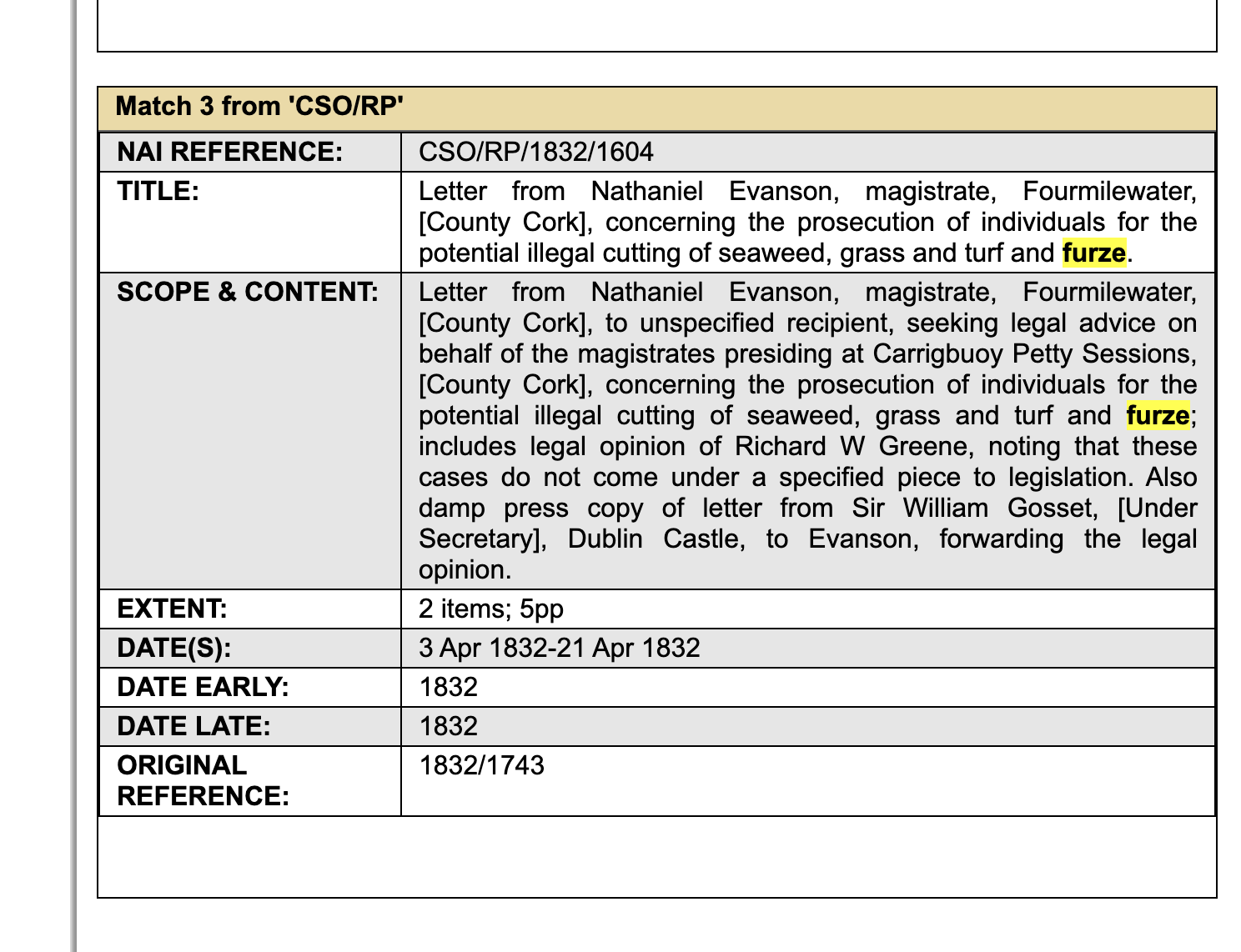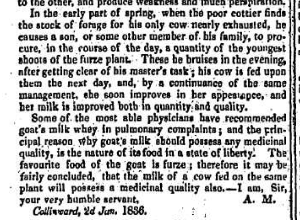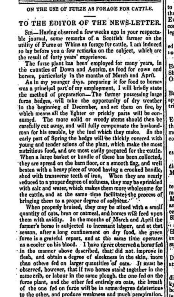 In his book, Farming In Ireland, John Feehan mentioned many registered accounts in legal documents from the 15th and 16th centuries listing gorse being used as animal fodder: “It was especially valued in feeding horses, though cattle throve on it also, either fed on its own or as part of a mixed diet.”