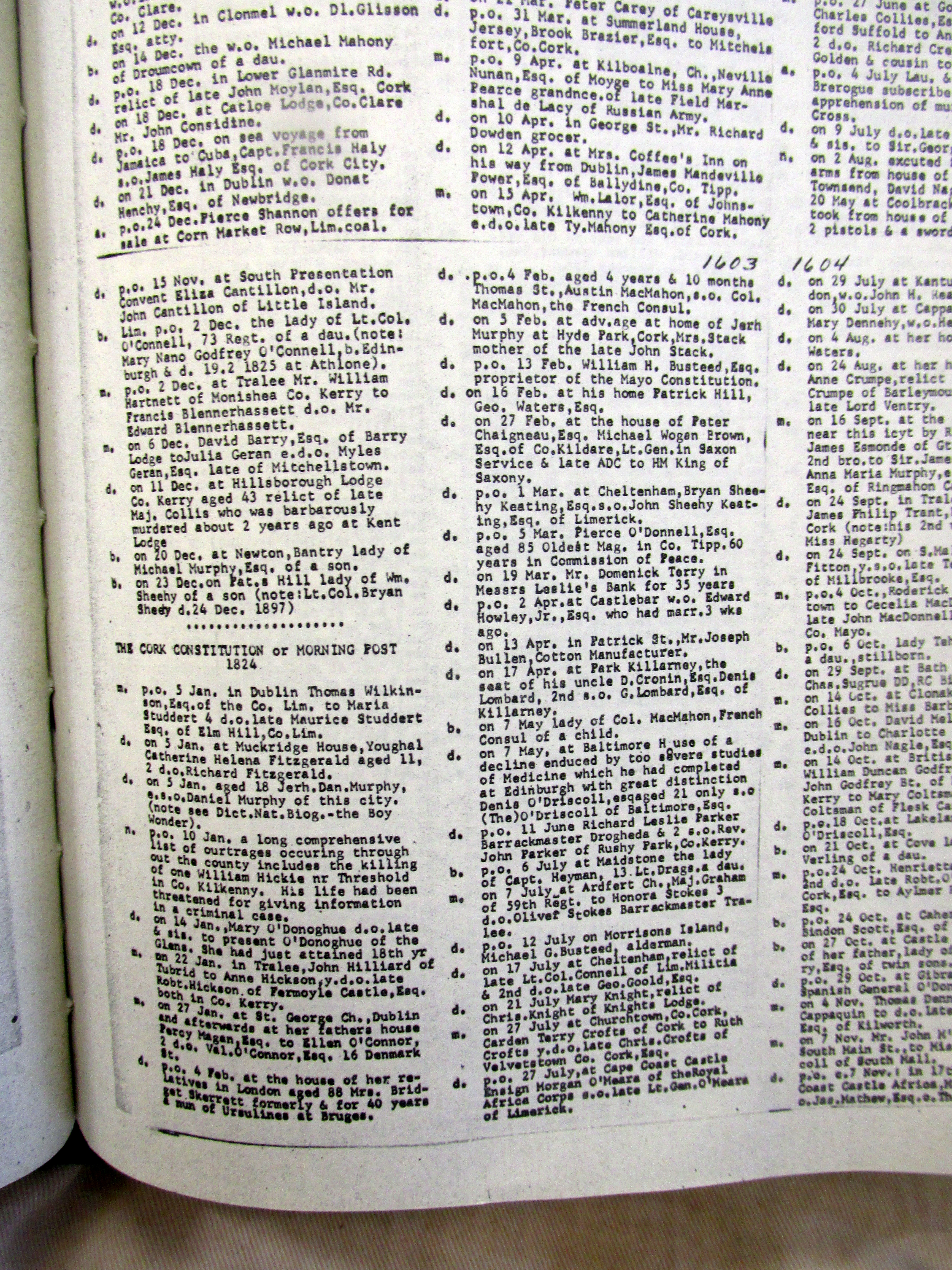 Died, 24th November 1820, Baltimore, Carolina, USA, Dr. Mathew O’Driscoll. of Creagh and Baltimore USA, 64, son of the late ‘The’ O’Driscoll, Creagh brother of Michael O’Driscoll Esq., and Died on the 7th May 1823, at Baltimore House, West Cork, of a Decline induced by too Severe Studies of Medicine which he had completed with great Distinction at Edinburgh Denis O’Driscoll Esq. aged 21, only son of ‘The’ O’Driscoll., Esq., of Baltimore and death of youngest daughter of ‘The O’Driscoll’ July 1826 from The Southern Reporter. |