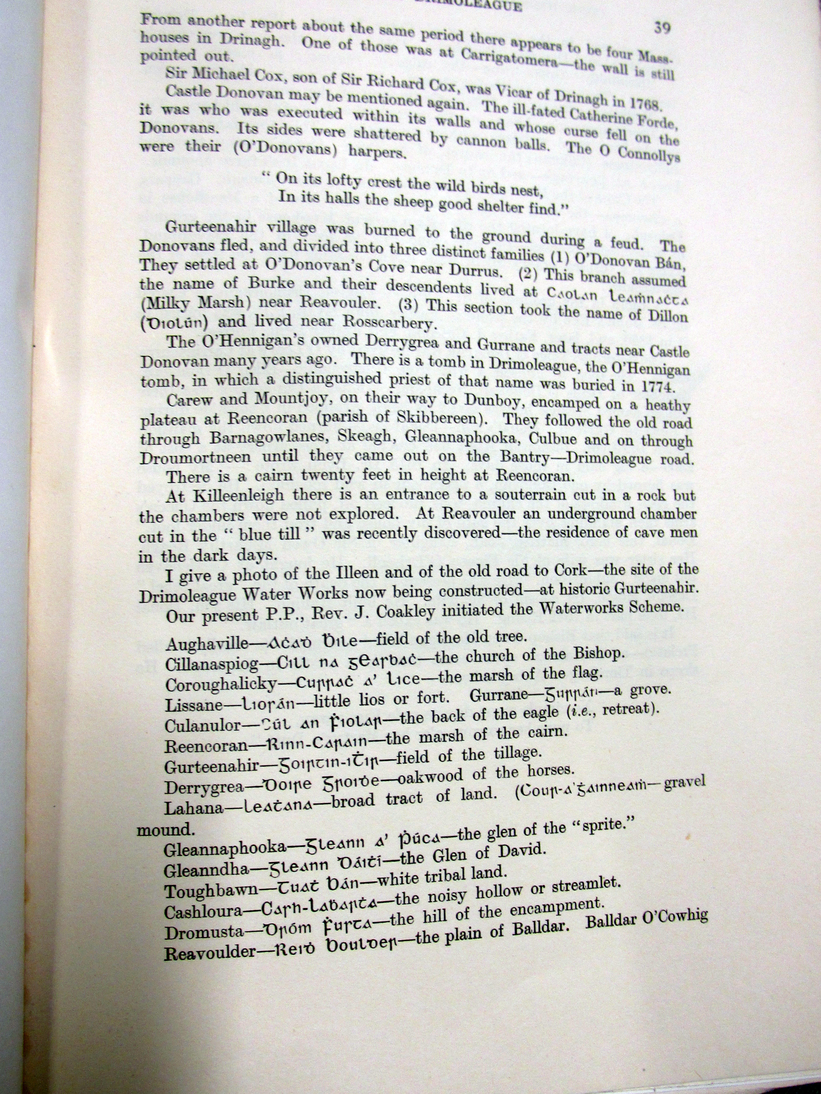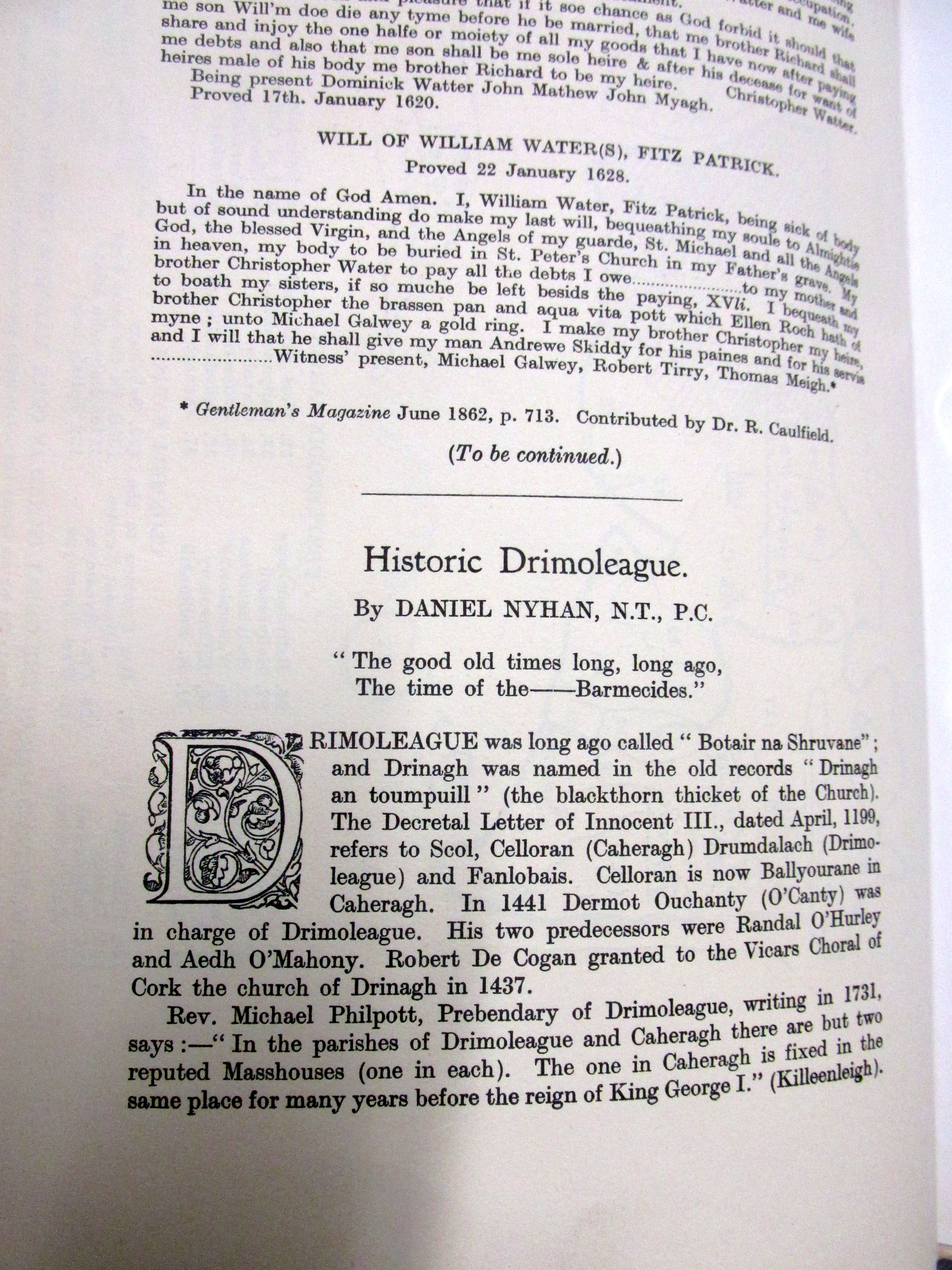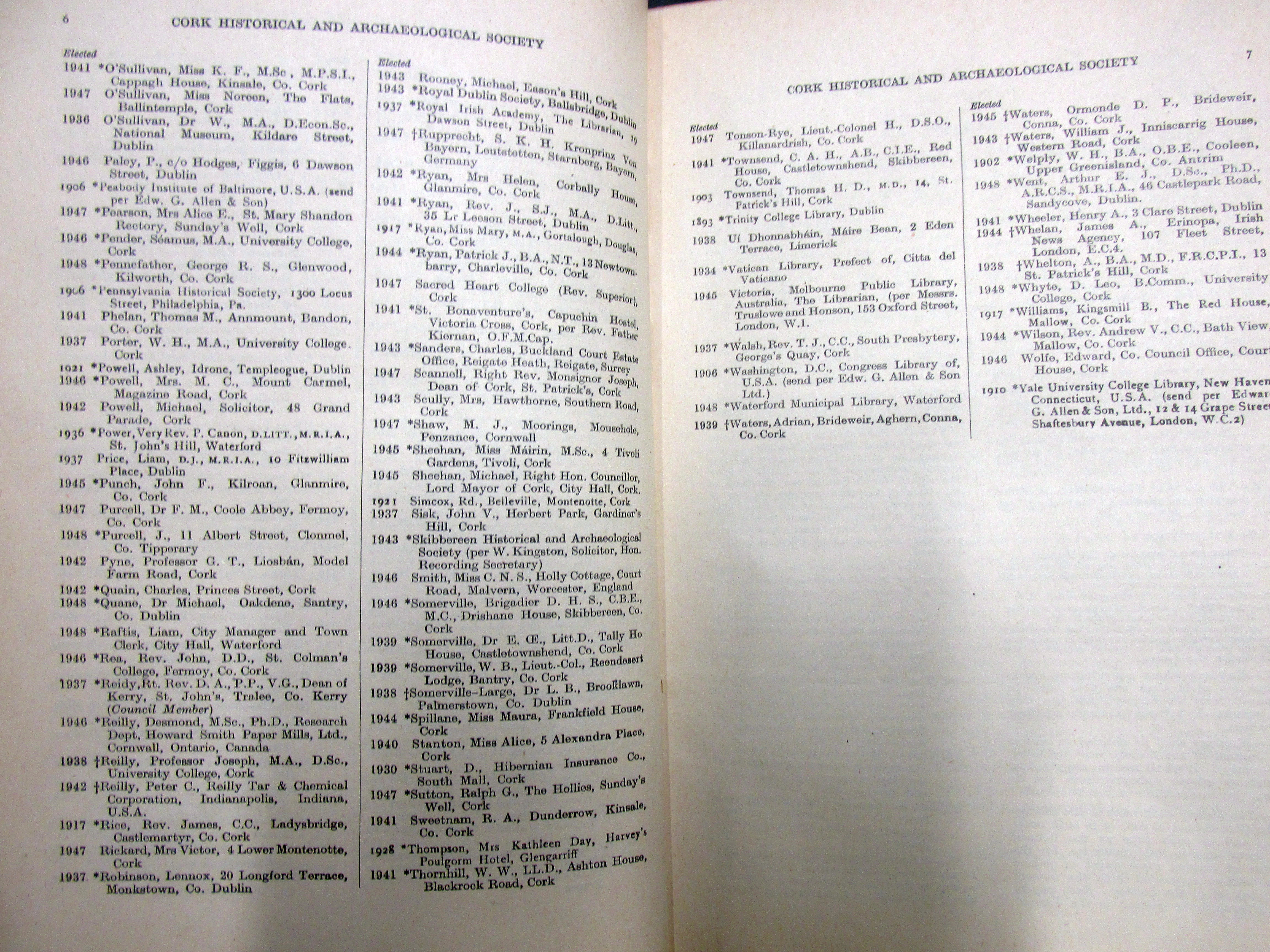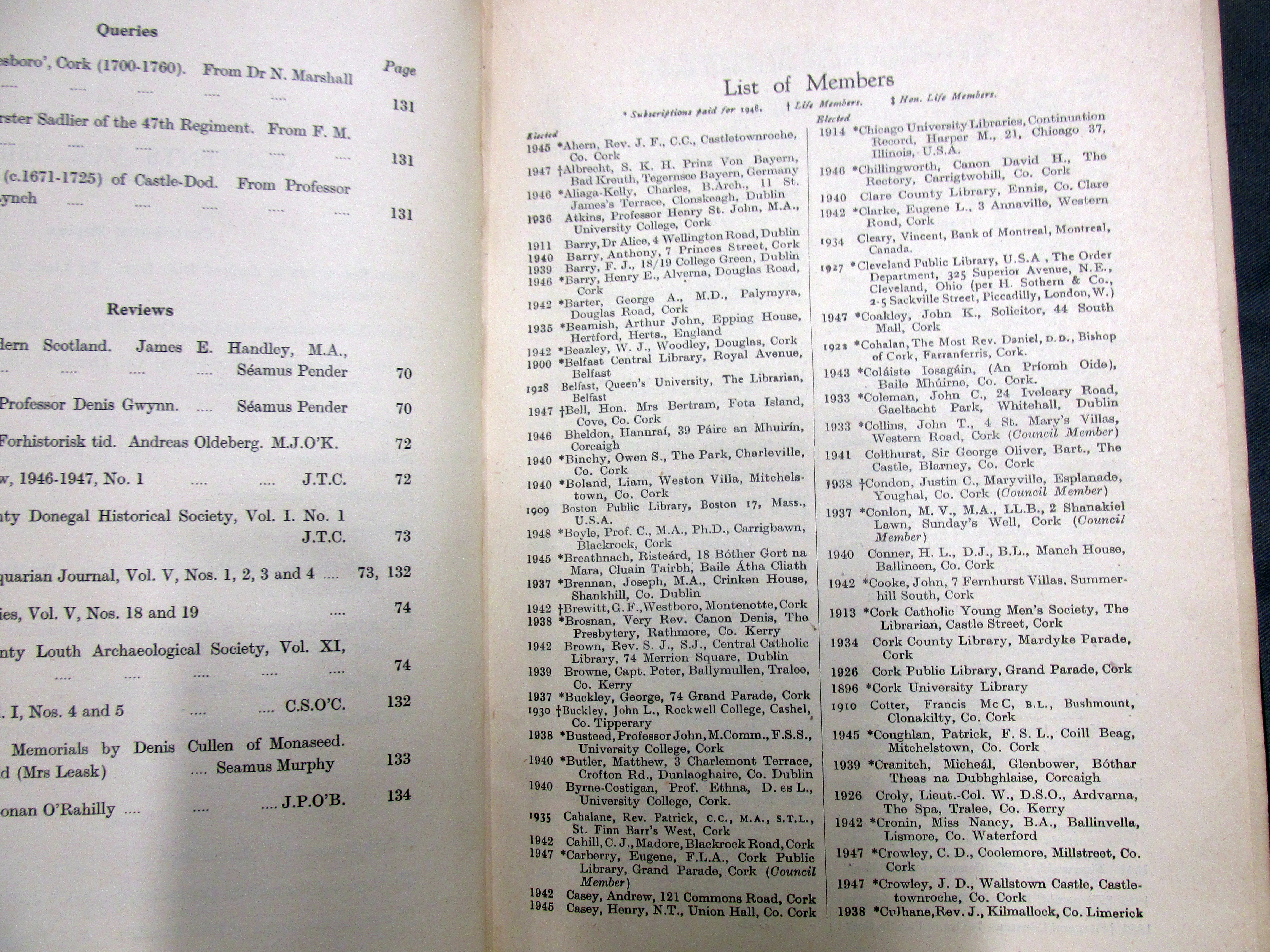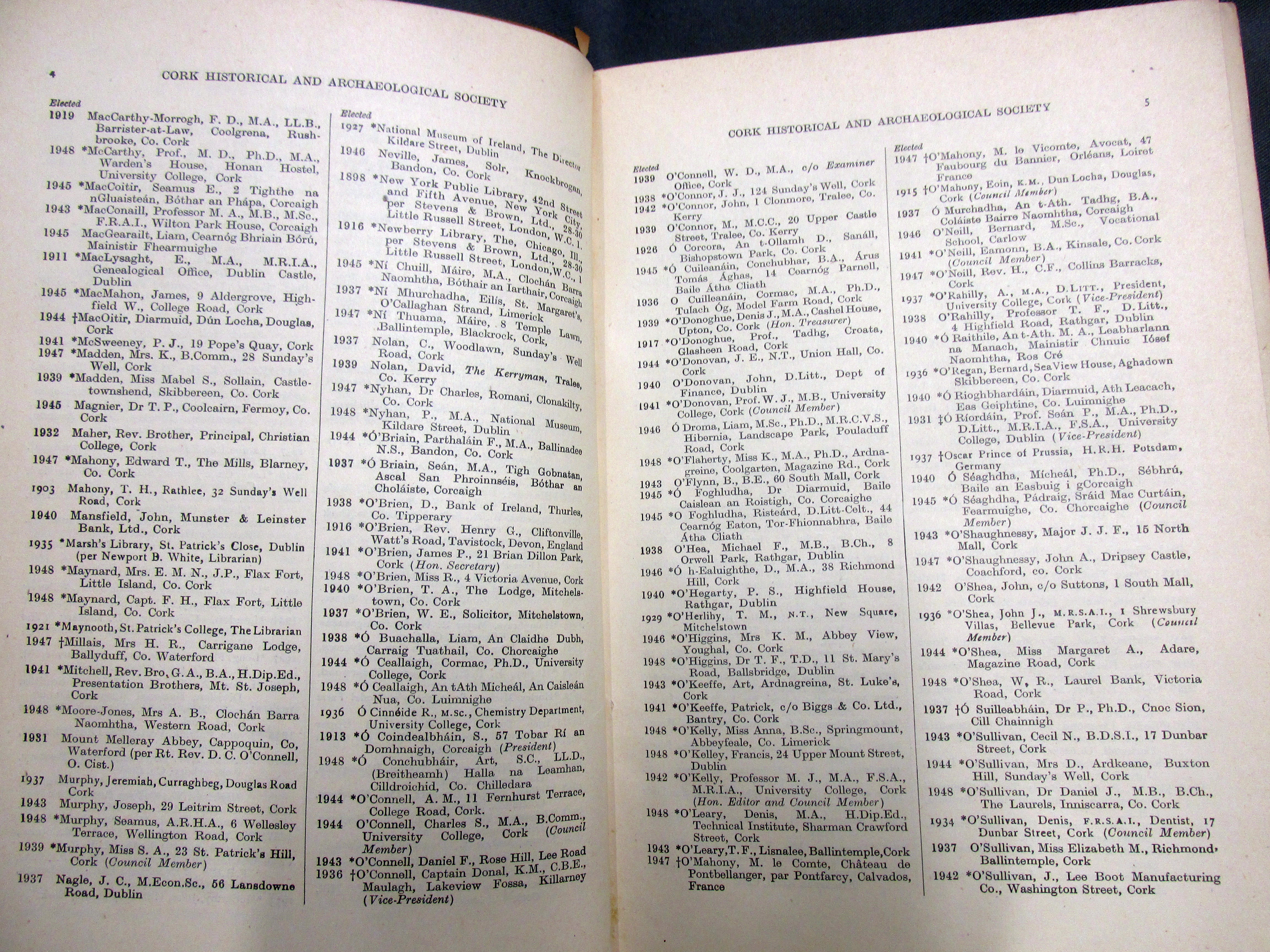 Membership lists of Cork Historical and Archaeological Society 1893 and 1945, snapshot of Cork Diaspora in Colonial Legal and Medical Service, and 1945 Gaelicisation of Irish Public Service, 1893 names include Francis Joseph Bigger, Belfast, Robert Day, Cork Antiquarian, Herbert Gillman Cork Historian, Rev. Graves Bishop of Limerick, Historian and Archaeologist, William Baylor Hartland Cork Horticulturist, P W Joyce Dublin Historian, Denny Lane, Cork Businessman writer and Historian, Lieutenant Francis O’Neill, Later Chief O’Neill, Chicago Police, Irish Music Collector, Canon Goodman, Skibbereen, Professor Of Irish TCD and Irish Music Collector, 1945 Historians Paddy O’Keeffe, Bantry, Bernard O’Regan, Aughadown, John T. Collins, Cork, Father TJ Walsh, Cork, Genealogists, Edward McLysaght, Herald’s Office, Dublin, William Henry Welply, Greenisland Co. Antrim, Count Eoin O’Mahony BL Cork, Sculptor Seamus Murphy, Cork, Playwright Lennox Robinson, Dublin, Oscar Prince of Prussia, Potsdam, Germany.