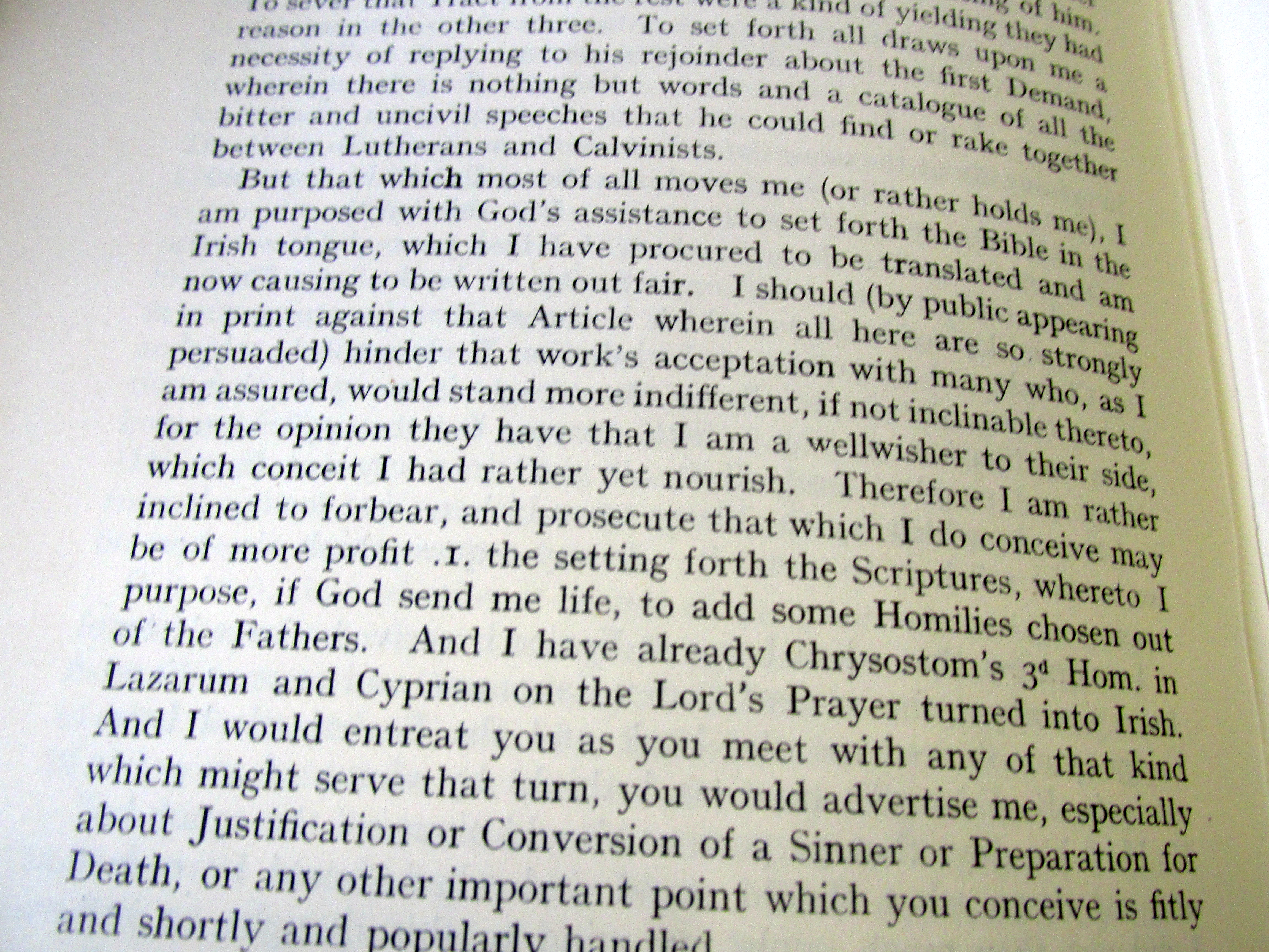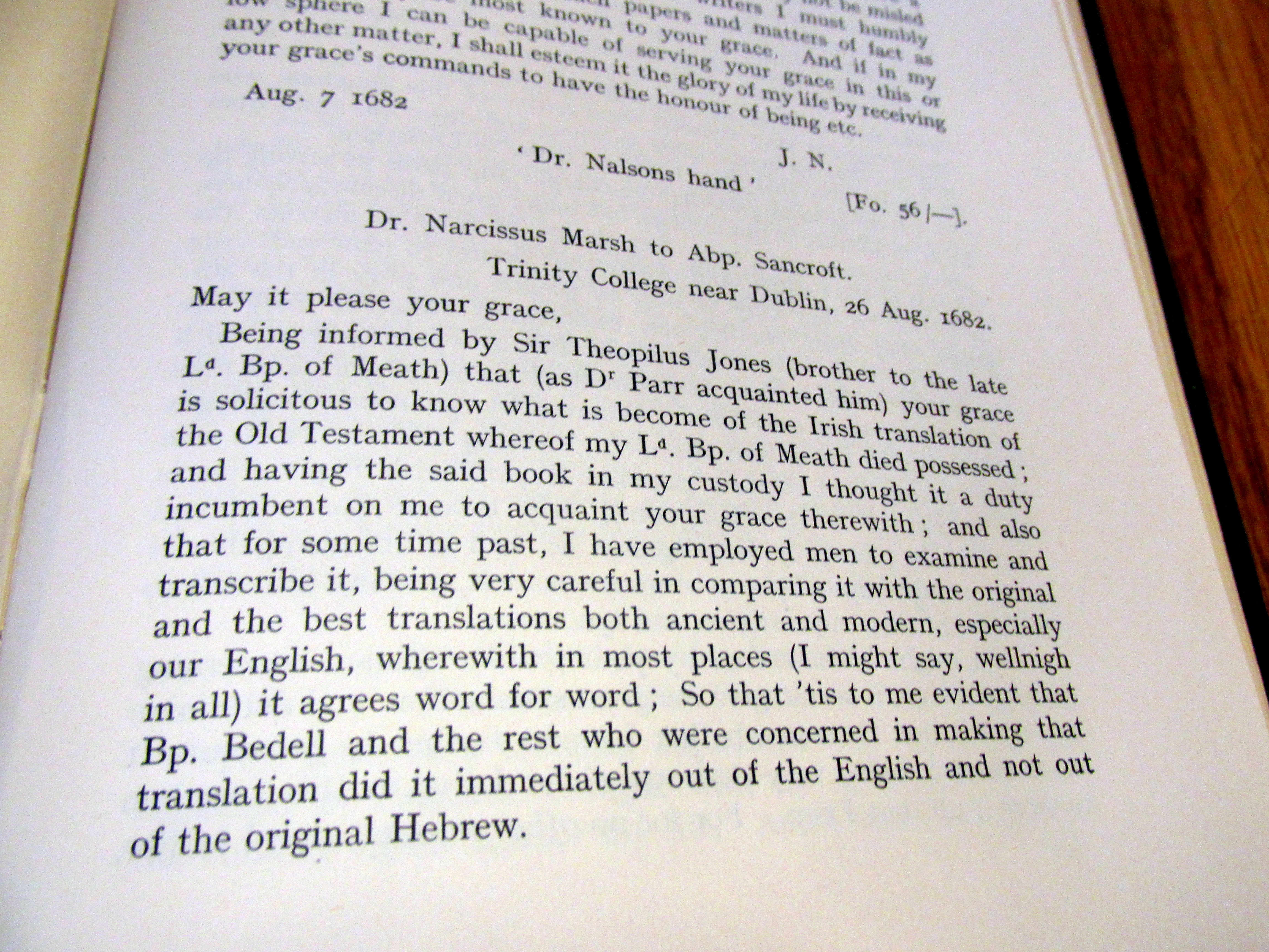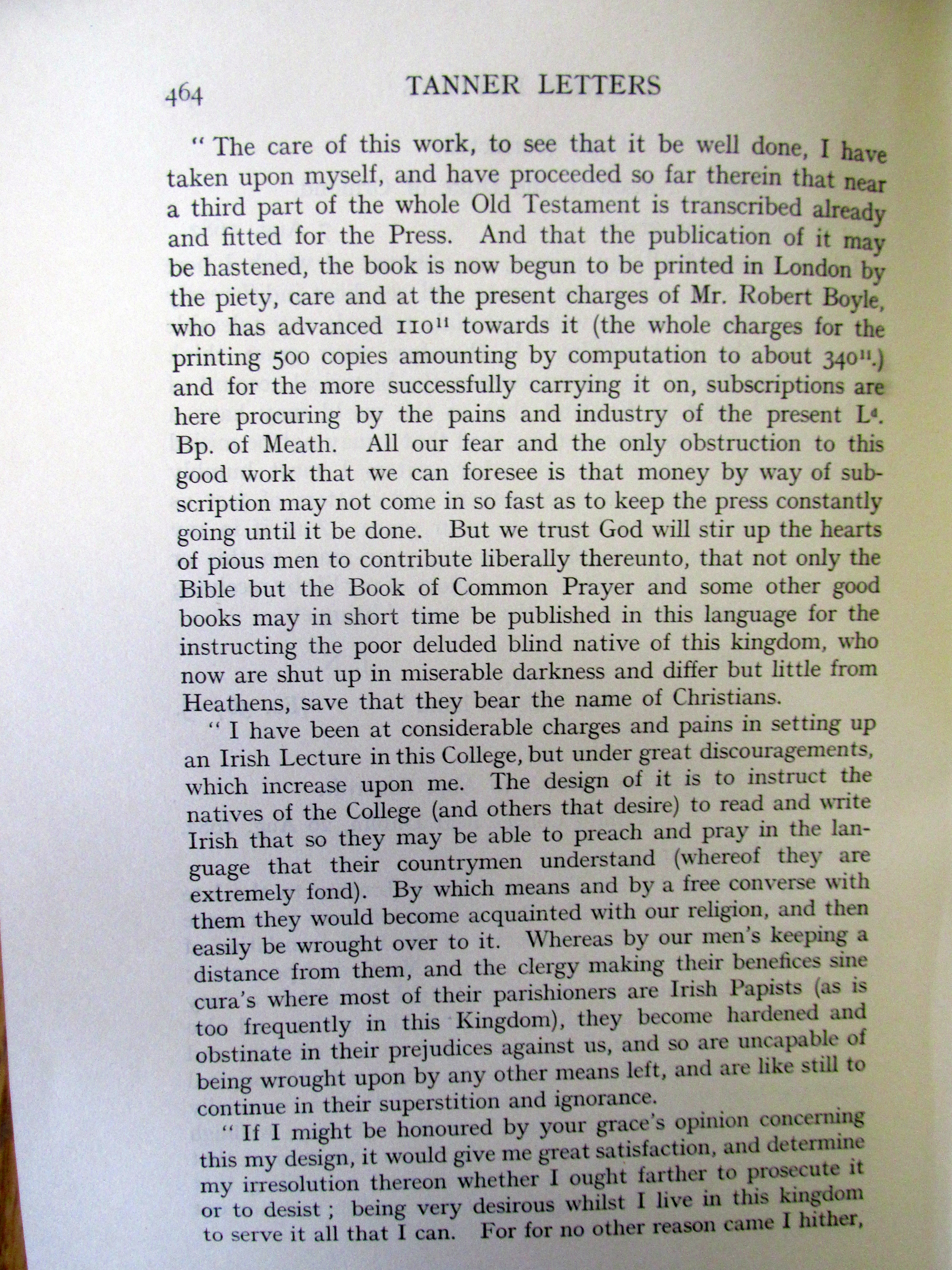Church of Ireland Bishop of Kilmore, William Bedell (1571-1642) letter 2nd February 1631 re his objective to ‘Set forth the Bible in the Irish Tongue’ and Dr. Narcissus Marsh’s )later Archbishop of Armagh) report on progress 1682 500 copies printed in London with financial assistance from Robert Boyle (1627-1691) from Earl of Cork family. his proposal to Church of Ireland Bishop of Kilmore, William Bedell (1571-1642) letter 2nd February 1631 re his objective to ‘Set forth the Bible in the Irish Tongue’ and Dr. Narcissus Marsh’s )later Archbishop of Armagh) report on progress 1682 500 copies printed in London with financial assistance from Robert Boyle (1627-1691) from Earl of Cork family. his proposal to establish an ‘Irish lecture’ at Trinity College, Dublin but under great discouragements an ‘Irish lecture’ at Trinity College, Dublin but under great discouragements.