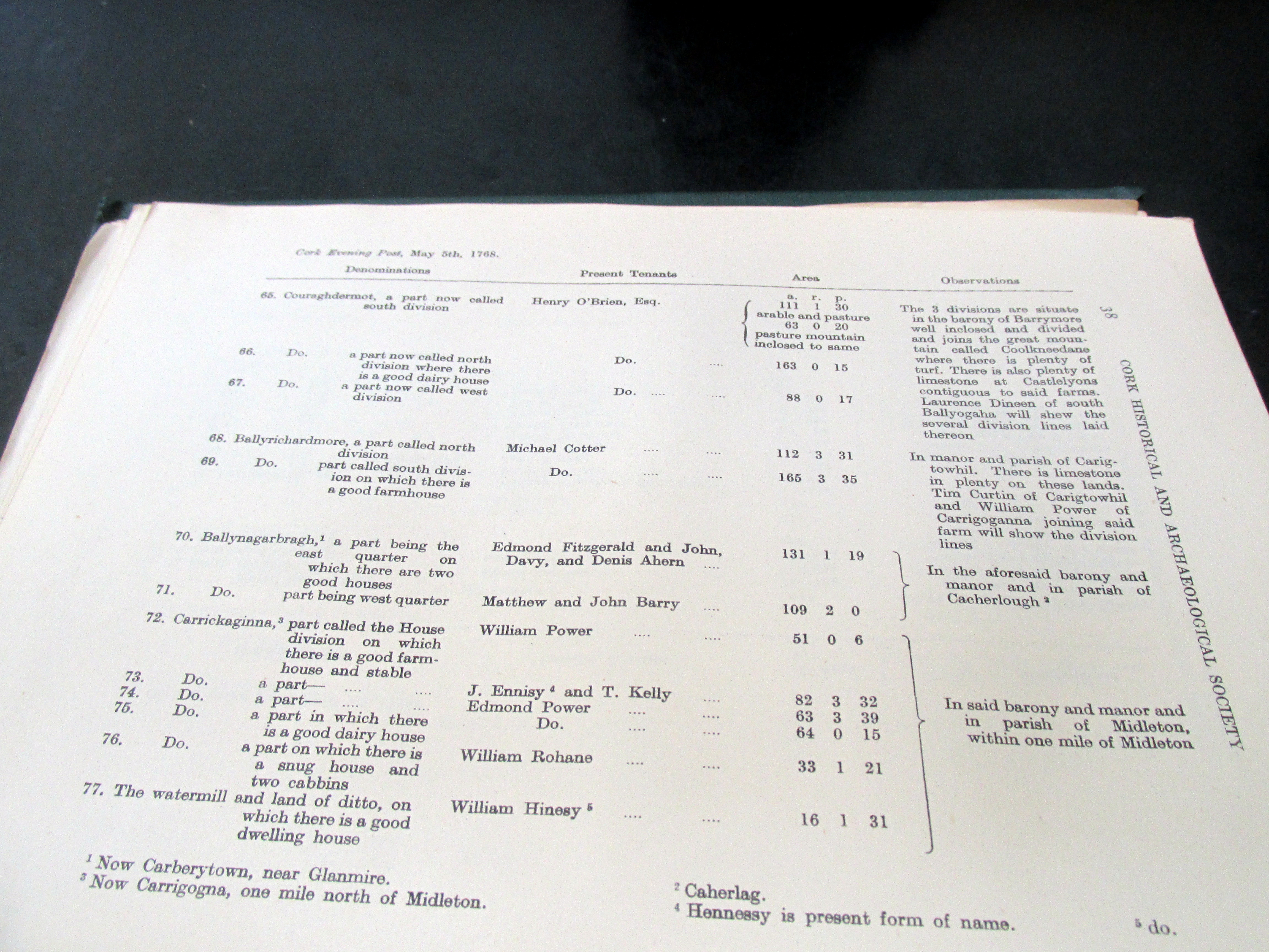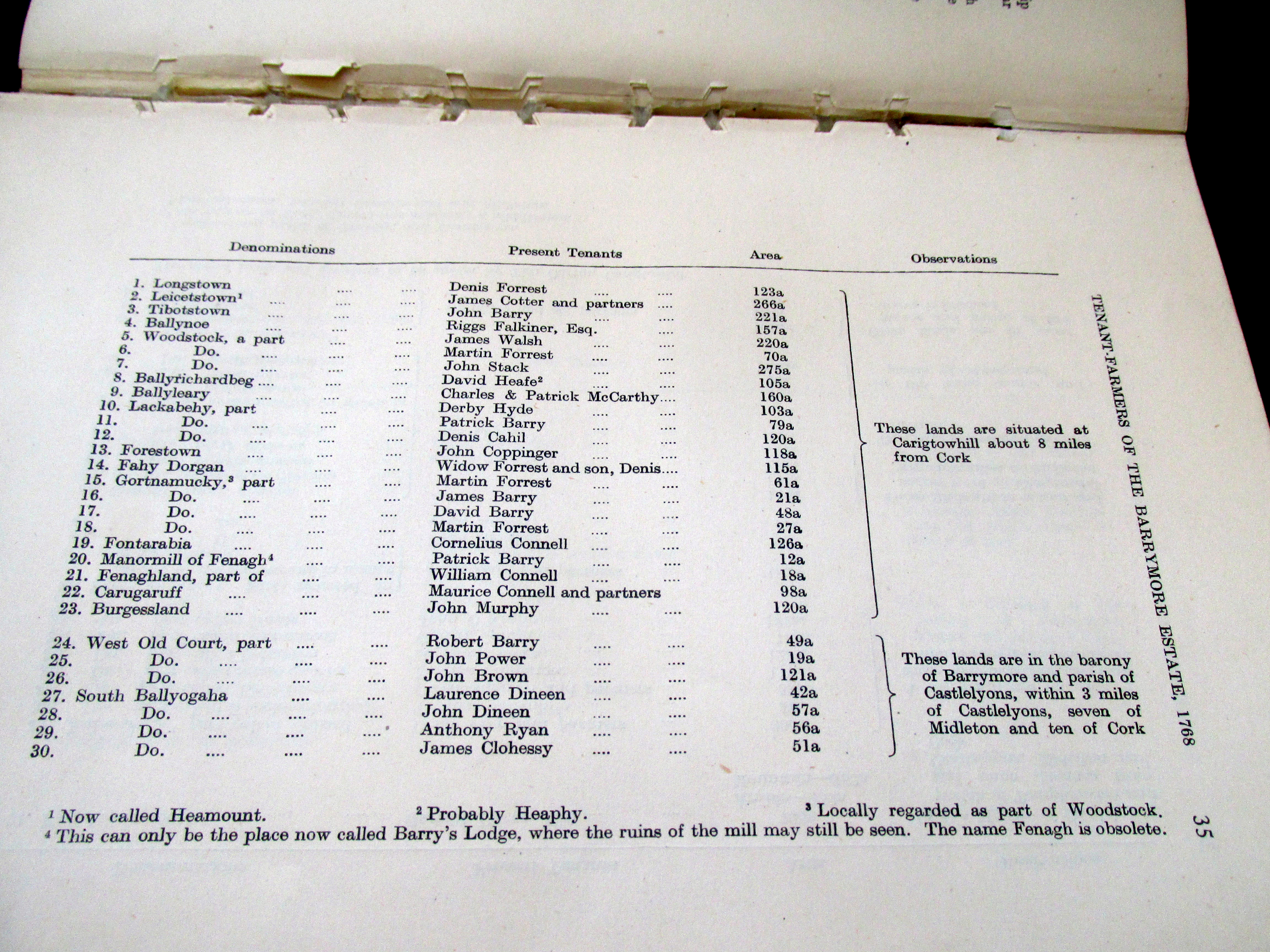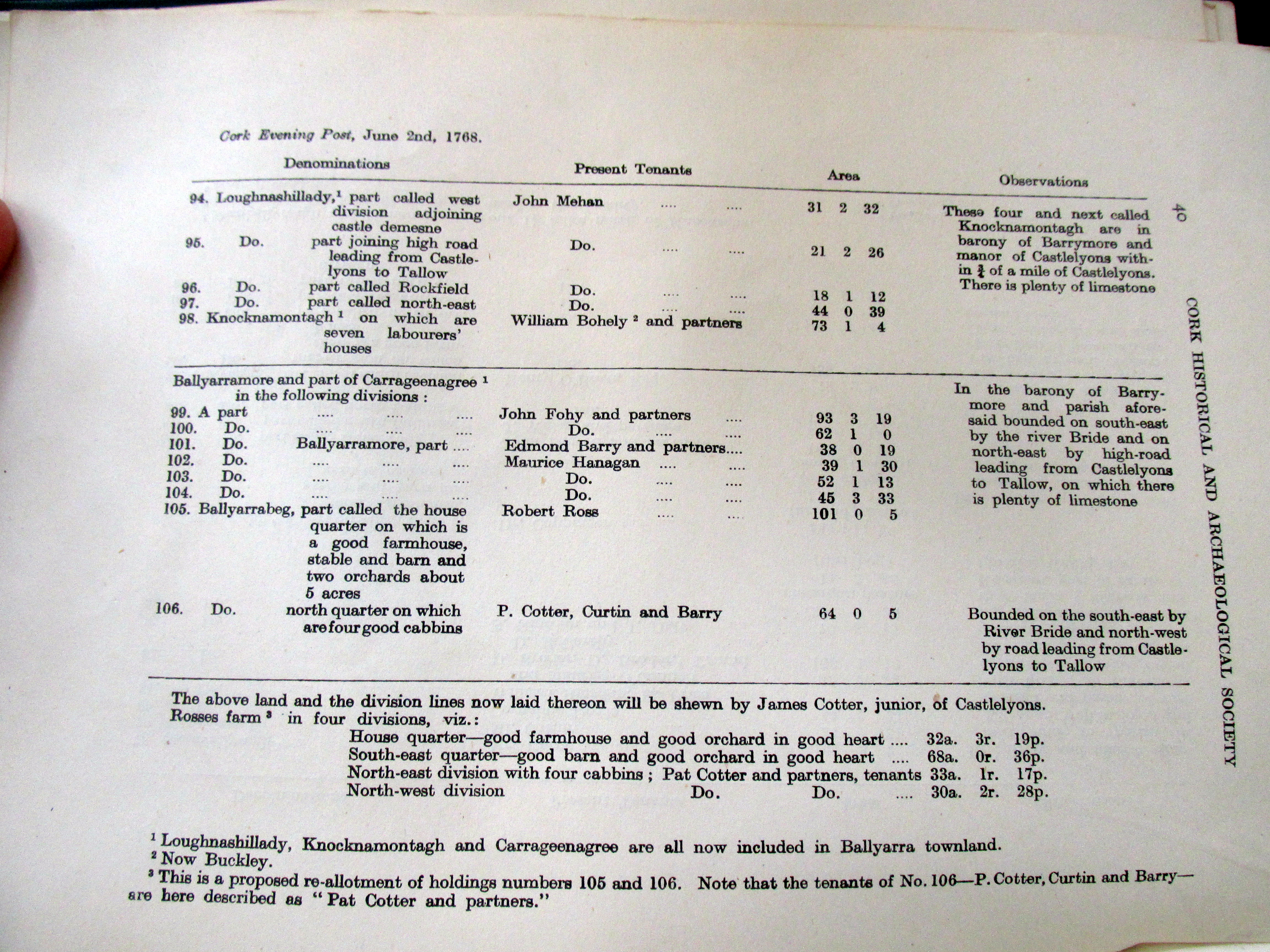 Records of Barrymore estate, East Cork, Castlelyons/Midleton/Castlemartyr/Great Island of Cobh, 1768, Tenants, Townlands, including, Longstown, Heamount/Leicestown, Tibotstown, Ballynoe, Woodstock, Ballyrichardbeg, Ballyleary, Lackabehy,Forestown, Fahy Dorgan, Gortnamucky/Woodstock, Fontarabia, Manormill/Fenagh (obsolete),Fenaghland, Caragaruf, Burgessland, West Old Court, South Ballyogaha, North Ballyogagho adjoining Great Mountain of Collelydana on which there is plenty of turf, Couraghdermot, Ballyrichardmore, Ballynagarbeagh (Caherlag/Glanmire), Carrickaginna/Carrigogna Midleton 1 mile, Shanavallyragh between Coolgerish and Kilcasanan part of Estate of Ignatius Gould Esq., Shanballagh and Monaneague, Coolnapishy/Peafield/Lisgould, Boghervodigg/Ballingarr, Loughnashillady, Knocknamontafg, Rockfield, Carrageenagree now Ballyarrra Townland, Barryarrabeg, Leases Rents, Agents, 107 holdings, 10,000 acres including Dr. McKenna complier of Irish Dictionary later Bishop of Cloyne and father of Gaelic Poet Dáithi De Barra (1758-1861) Dáth A’Ghleanna, extracted by Líam Ó Buachalla in 1946, from Cork Evening Post of 1768.