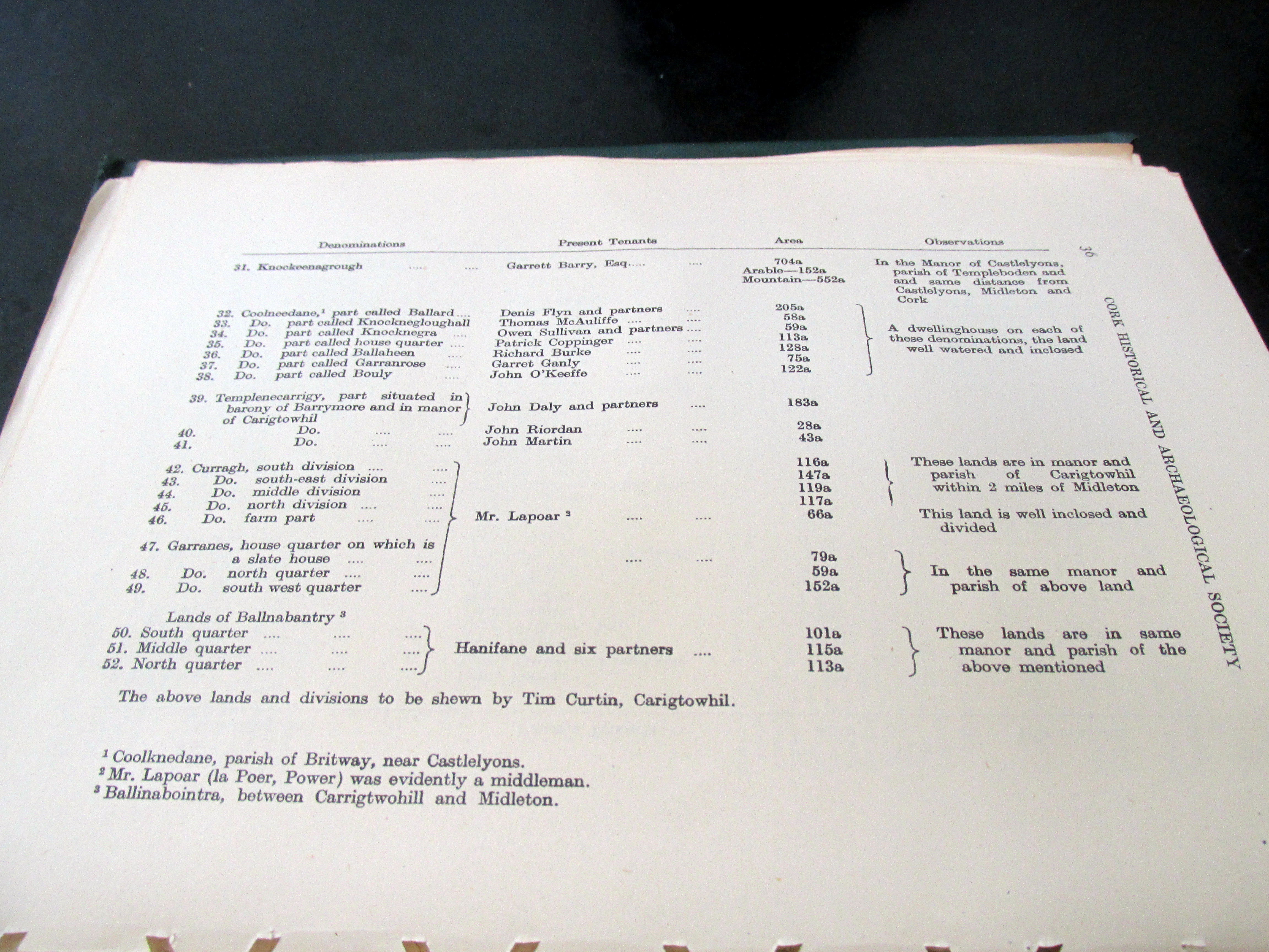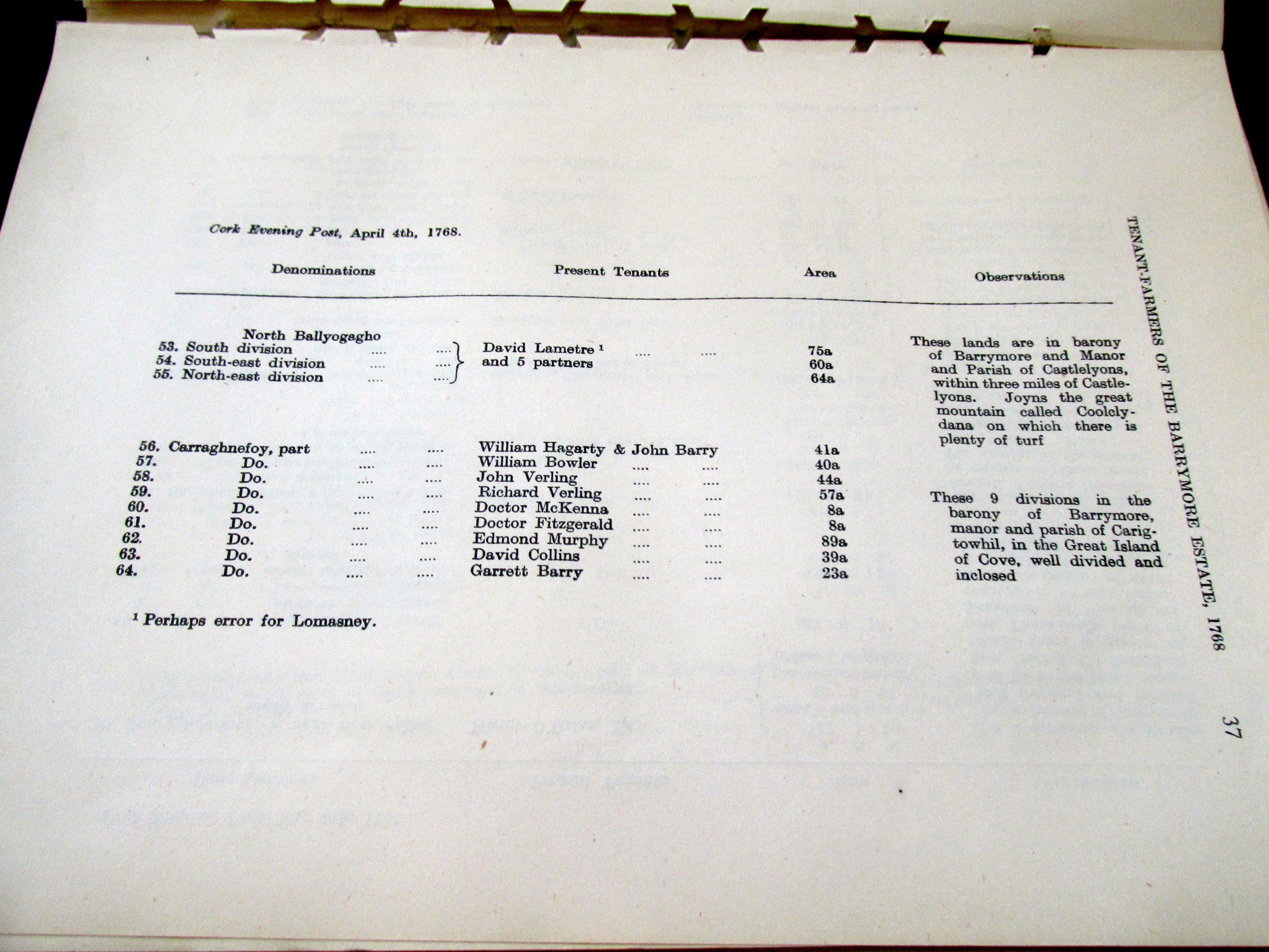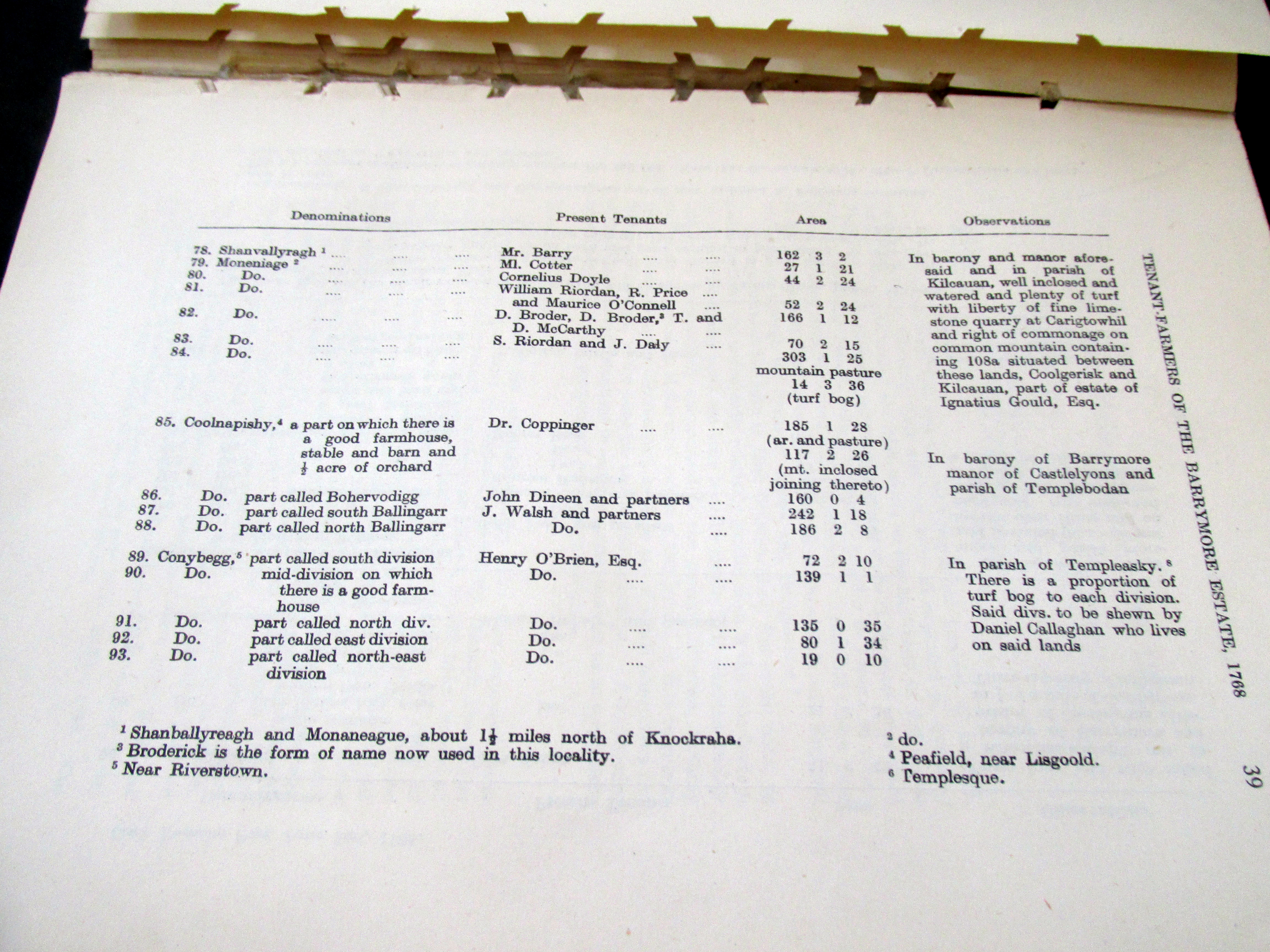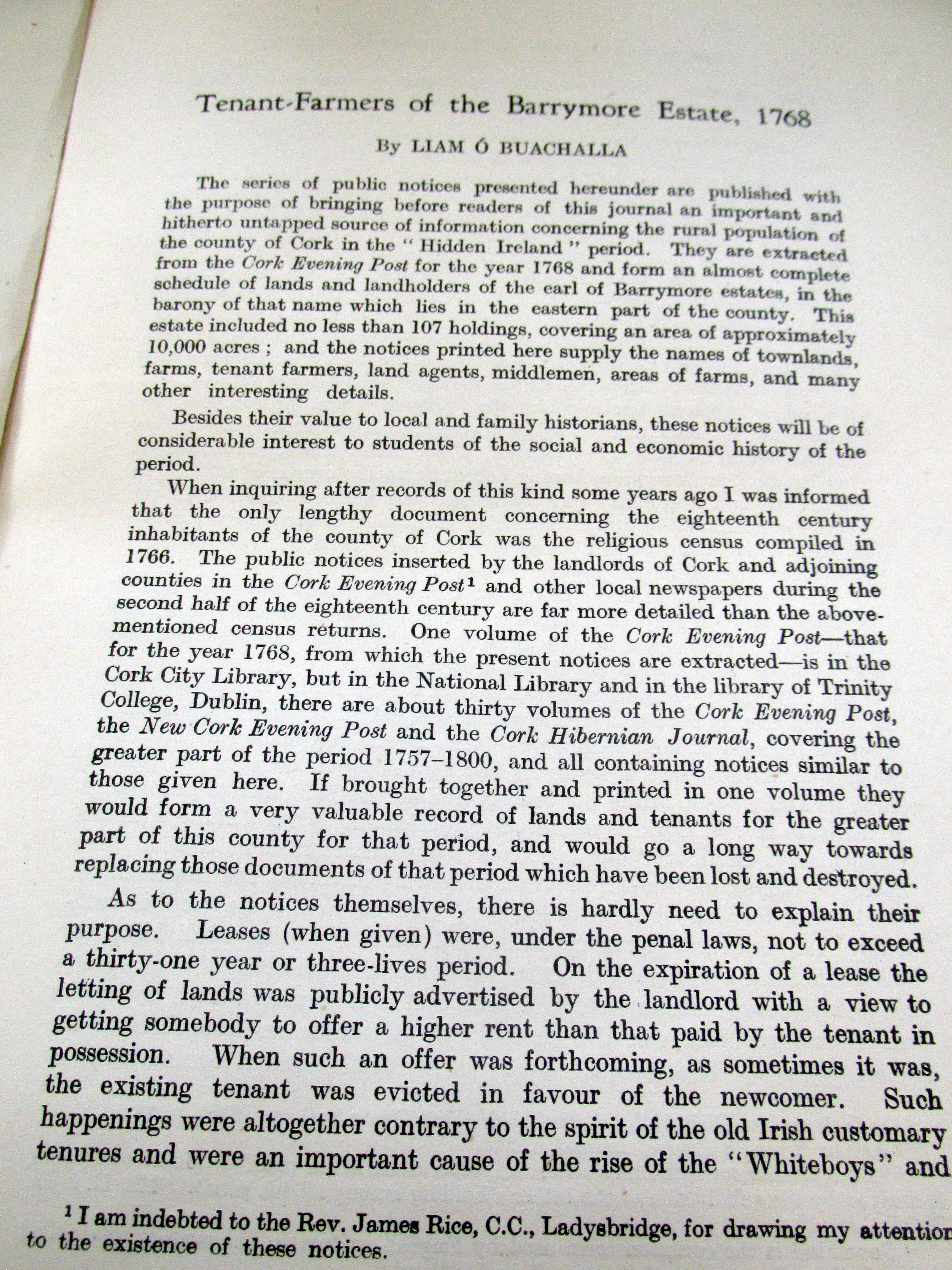 Records of Barrymore estate, East Cork, Castlelyons/Midleton/Castlemartyr/Great Island of Cobh, 1768, Tenants, Townlands, including, Longstown, Heamount/Leicestown, Tibotstown, Ballynoe, Woodstock, Ballyrichardbeg, Ballyleary, Lackabehy,Forestown, Fahy Dorgan, Gortnamucky/Woodstock, Fontarabia, Manormill/Fenagh (obsolete),Fenaghland, Caragaruf, Burgessland, West Old Court, South Ballyogaha, North Ballyogagho adjoining Great Mountain of Collelydana on which there is plenty of turf, Couraghdermot, Ballyrichardmore, Ballynagarbeagh (Caherlag/Glanmire), Carrickaginna/Carrigogna Midleton 1 mile, Shanavallyragh between Coolgerish and Kilcasanan part of Estate of Ignatius Gould Esq., Shanballagh and Monaneague, Coolnapishy/Peafield/Lisgould, Boghervodigg/Ballingarr, Loughnashillady, Knocknamontafg, Rockfield, Carrageenagree now Ballyarrra Townland, Barryarrabeg, Leases Rents, Agents, 107 holdings, 10,000 acres including Dr. McKenna complier of Irish Dictionary later Bishop of Cloyne and father of Gaelic Poet Dáithi De Barra (1758-1861) Dáth A’Ghleanna, extracted by Líam Ó Buachalla in 1946, from Cork Evening Post of 1768.