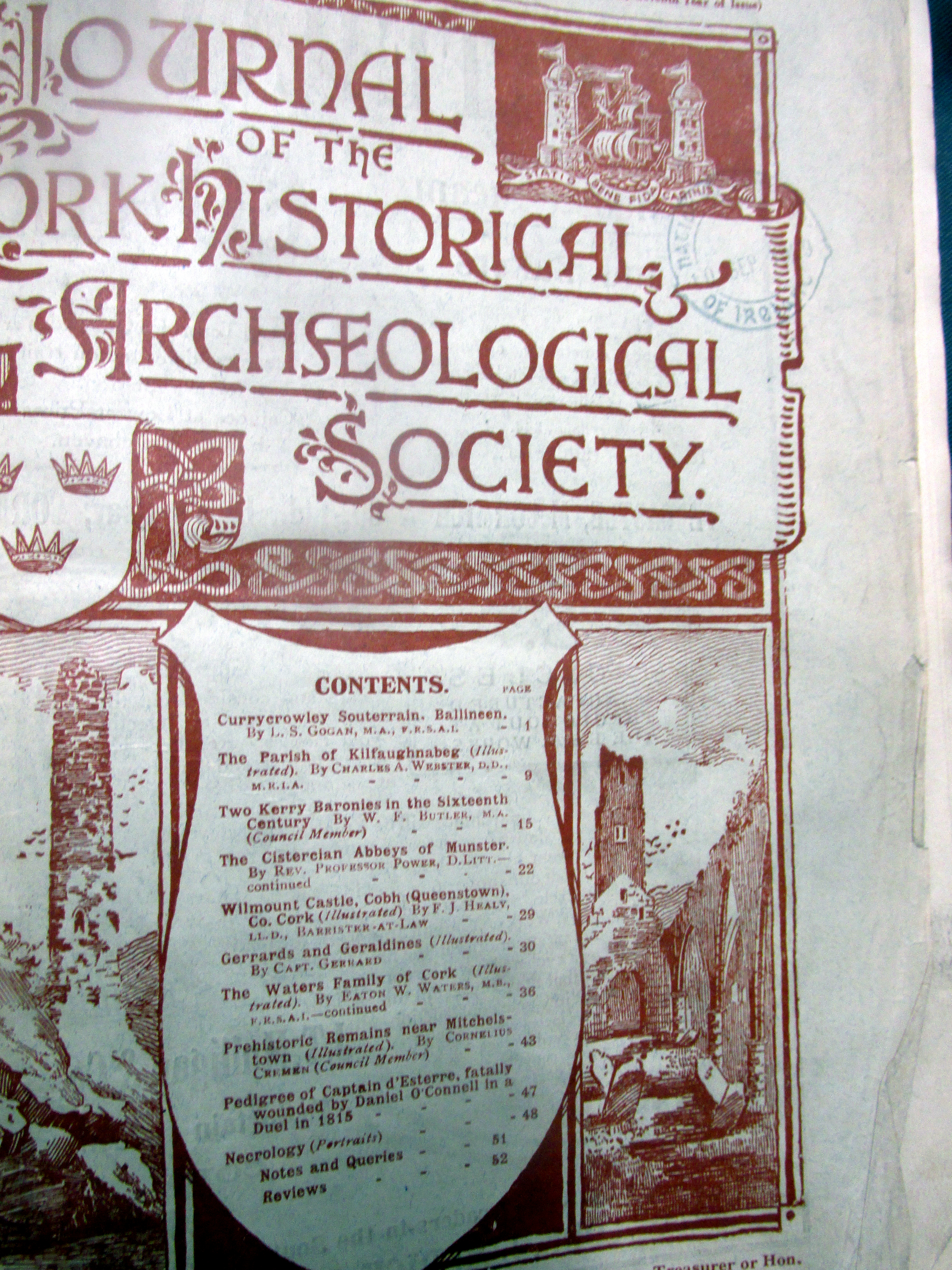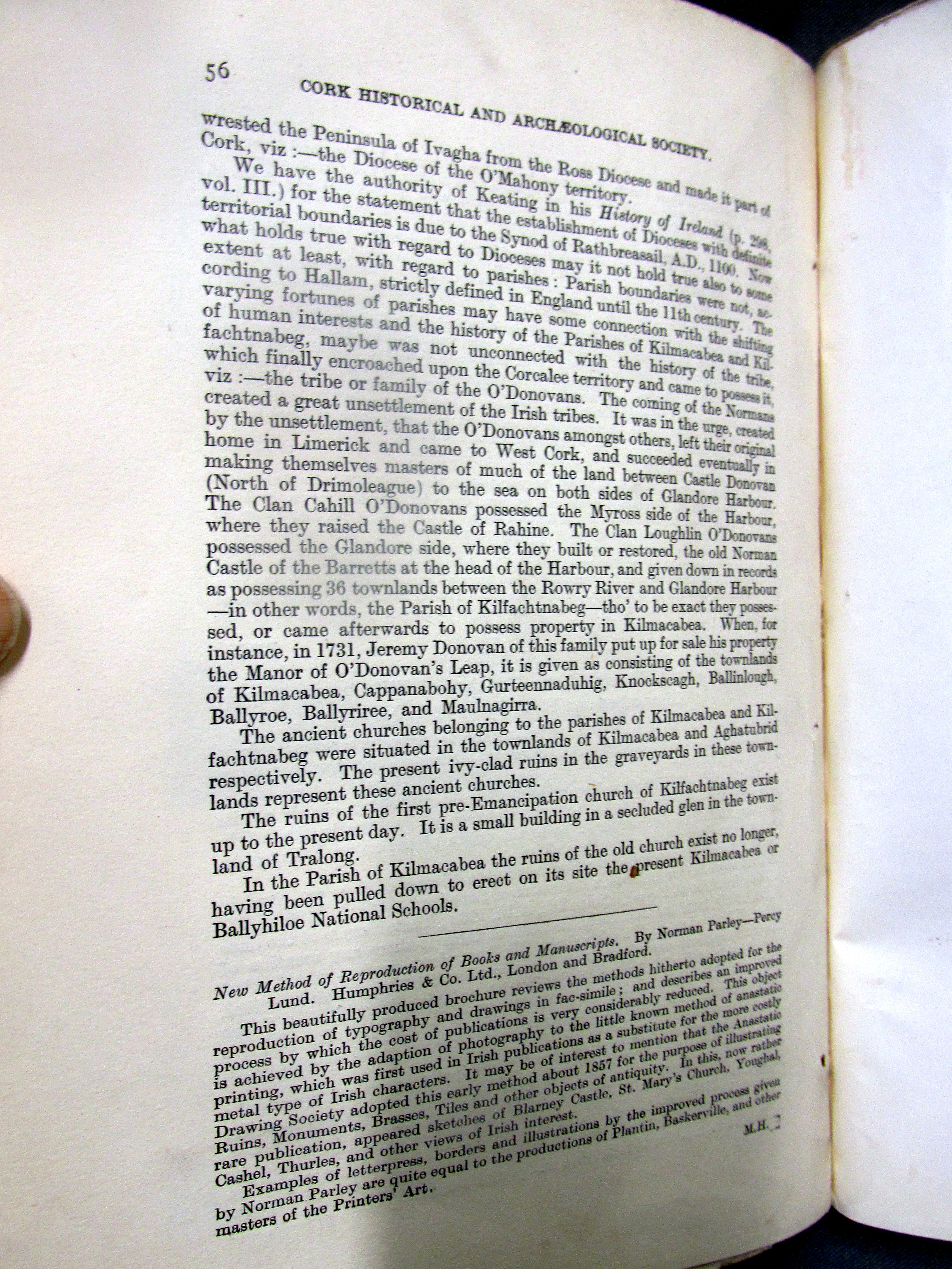 History of Parish of Kilmacabea (Glandore and Leap), West Cork, 1904, J.M. Burke B.A., B.L., Genealogies, Townlands, Coppinger’s Court, Antiquities.