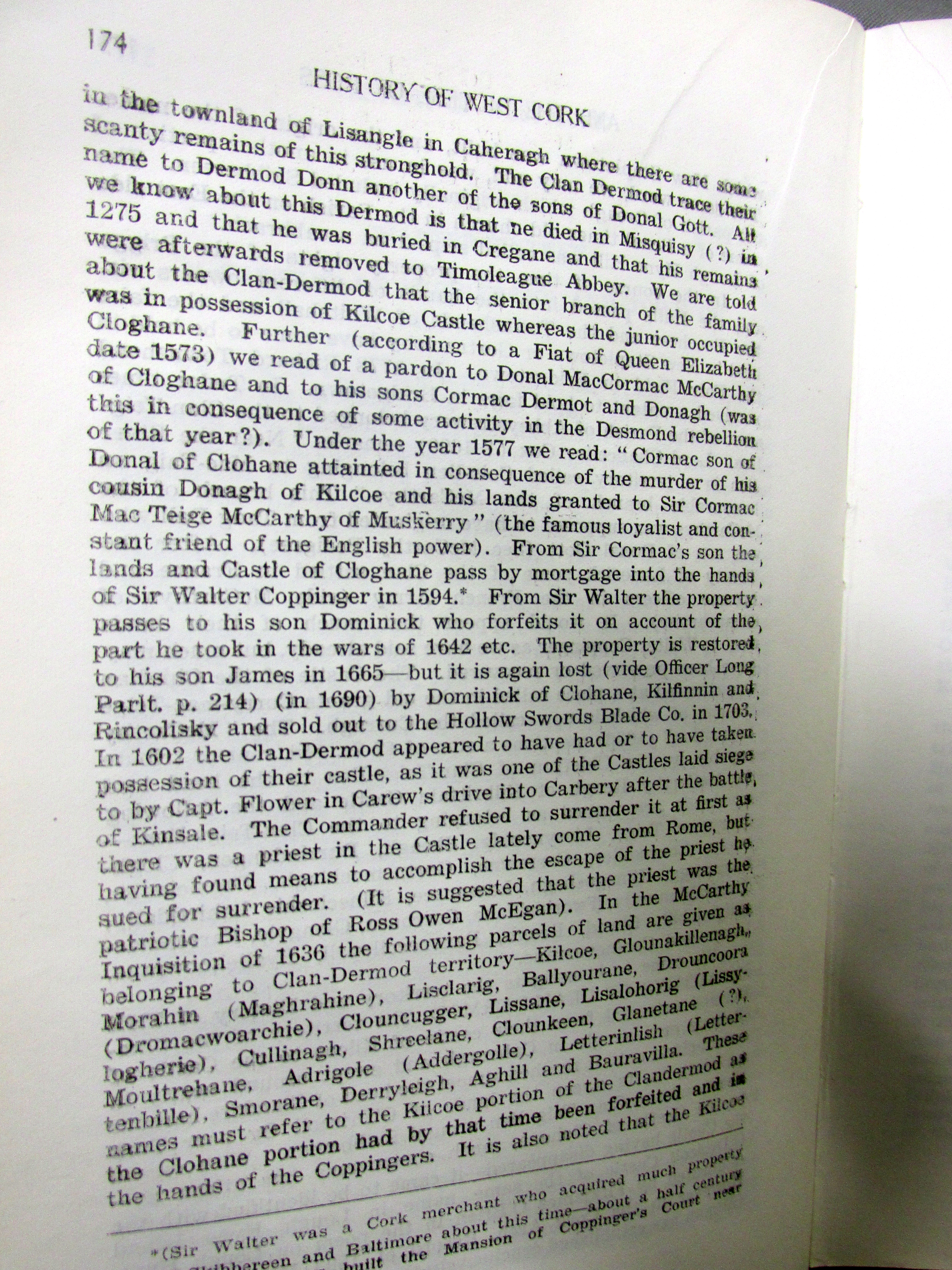 The Castle was in the townland of Scart around a mile from Durrus Cross adn the family moved to the then new Castle at Cul-na-Long, Gearhameen, Durrus s till well preserved. Their lands partly came into possession of Sir. Walter Coppinger (the Coppingers are of Hiberno-Danish descent) who went into possession when they defaulted on the mortgage c 1640 these would be the eastern end Caheragh and Ballycomane. His land was forfeit due to rebellion and eventually came into the possession of the Frekes, Lord Carbery,