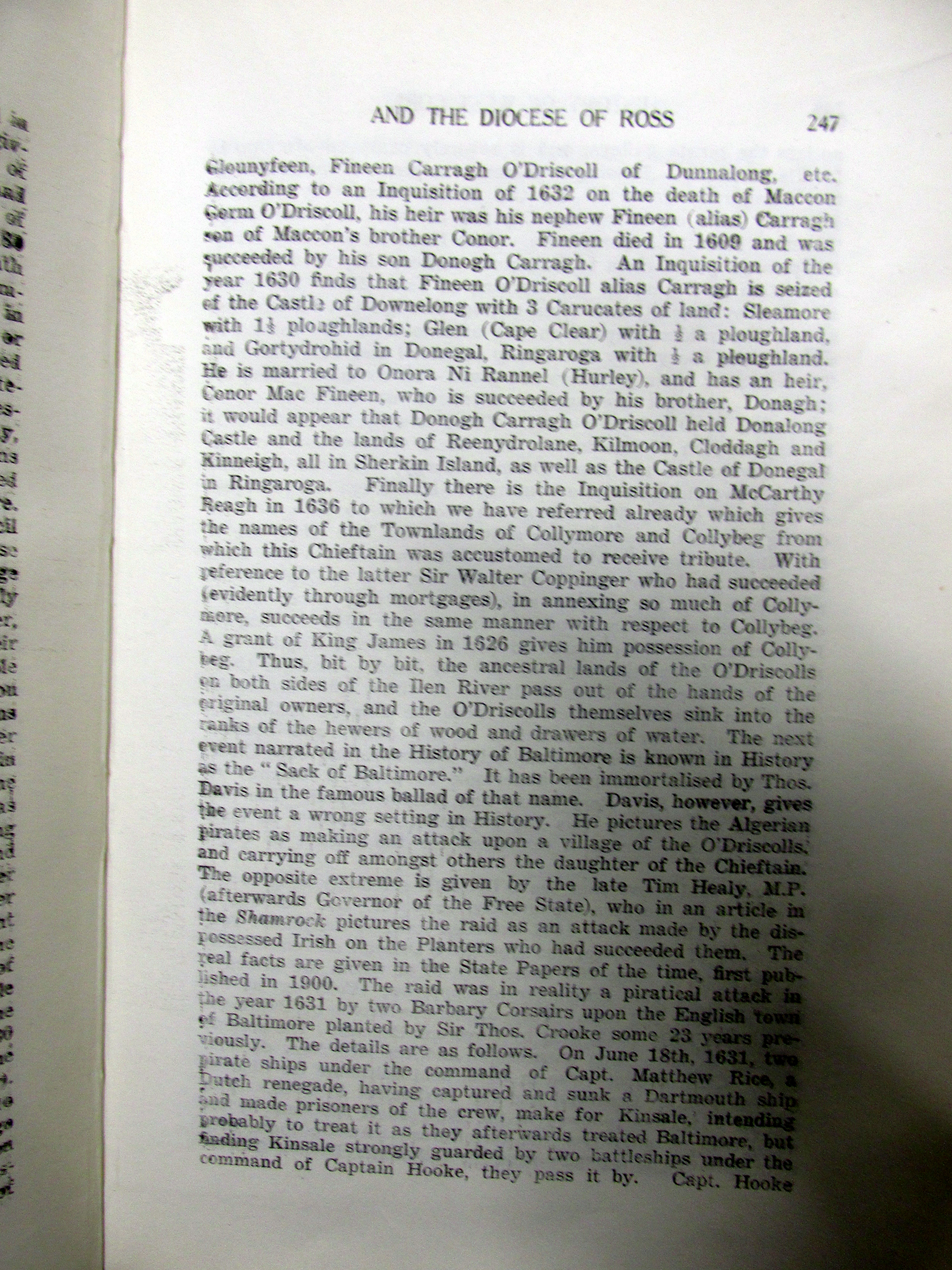 Died, 24th November 1820, Baltimore, Carolina, USA, Dr. Mathew O’Driscoll. of Creagh and Baltimore USA, 64, son of the late ‘The’ O’Driscoll, Creagh brother of Michael O’Driscoll Esq., and Died on the 7th May 1823, at Baltimore House, West Cork, of a Decline induced by too Severe Studies of Medicine which he had completed with great Distinction at Edinburgh Denis O’Driscoll Esq. aged 21, only son of ‘The’ O’Driscoll., Esq., of Baltimore and death of youngest daughter of ‘The O’Driscoll’ July 1826 from The Southern Reporter.