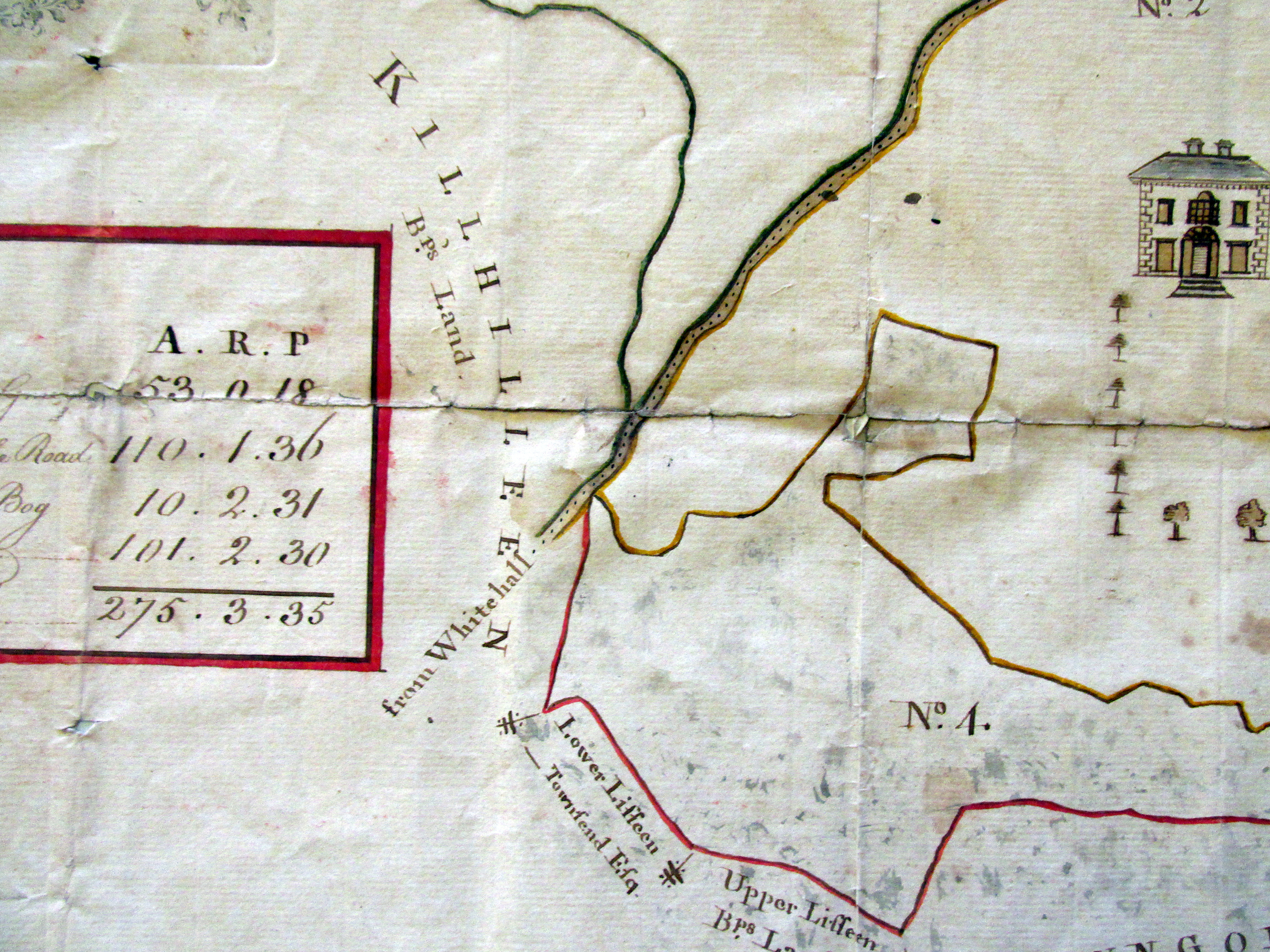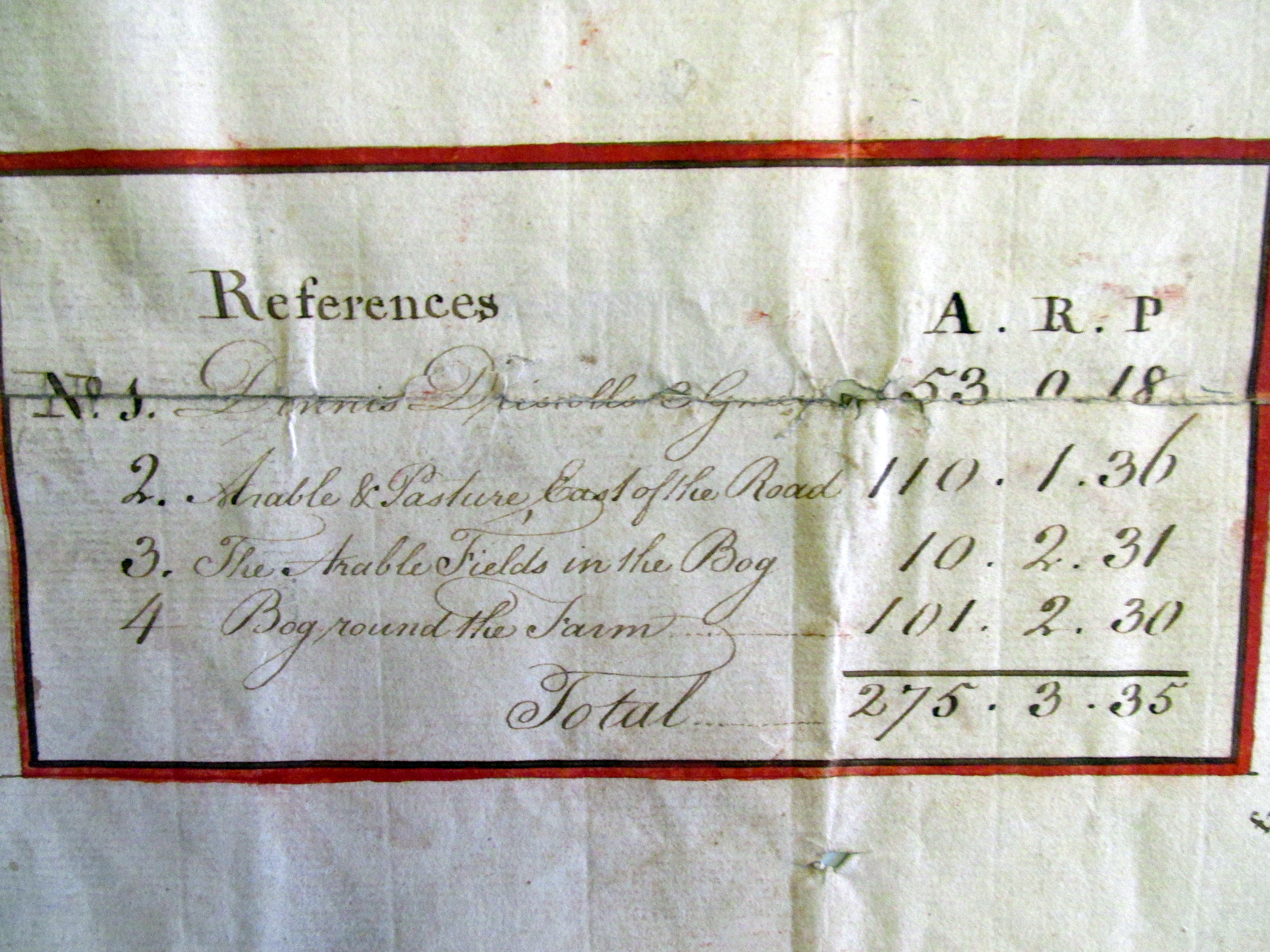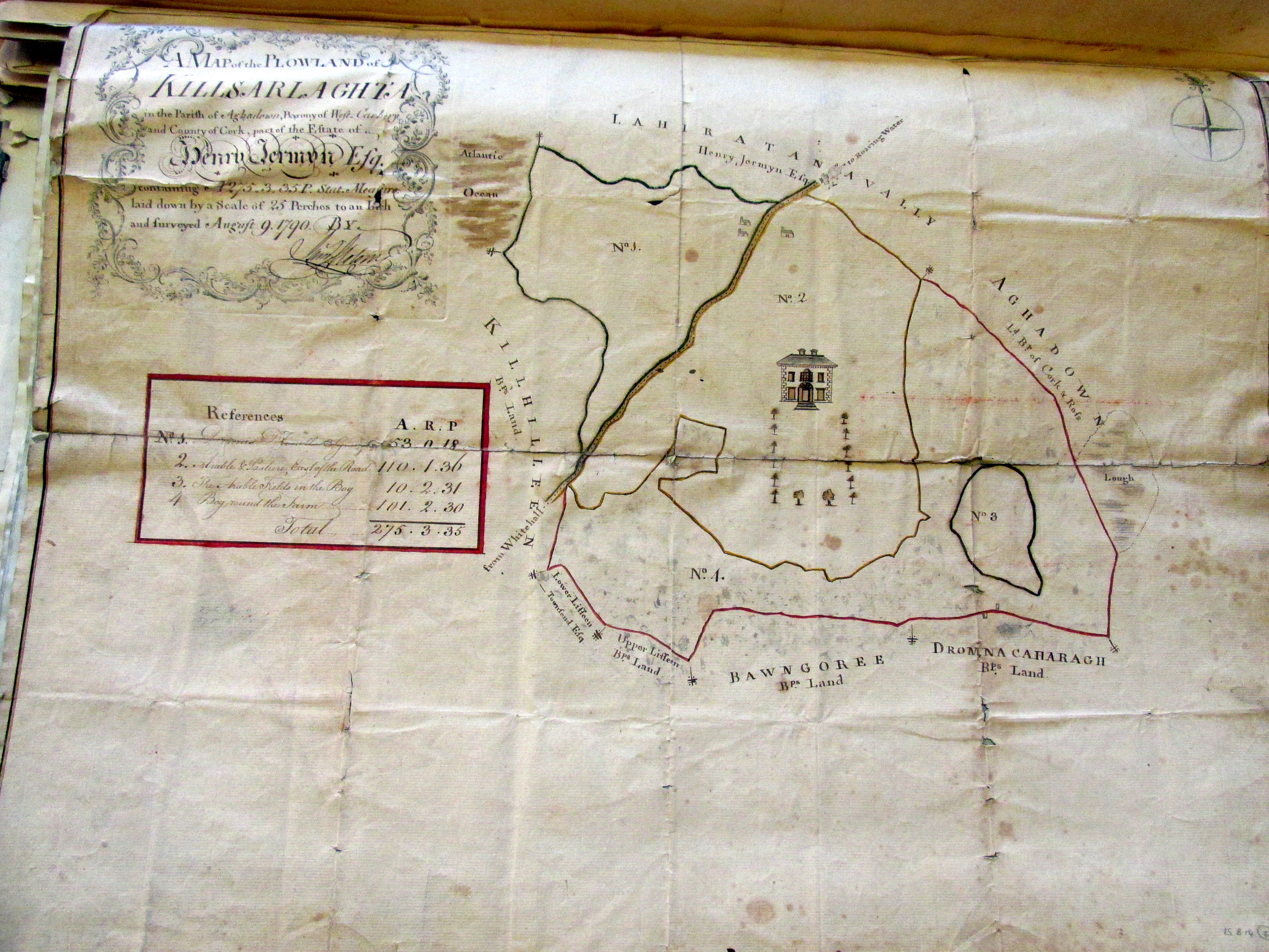 Estate of Henry Jermyn Esq, Aughadown, Skibbereen, West Cork, 1,275 acres, part survey of Killsarlaghta, Aughadown, 1790 by John Molony, Ploughland occupied by Denis Driscoll and Syeey/Gosnell?? 275 acres, showing also Bishop of Cork and Ross holdings at Aughadown, Dromnacaharagh, Upper and Lower Lisheen, Killhilleen, Bawngoree, Whitehall, Roaring Water Road.