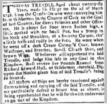 Escape of Thomas Trendle (Description of Clothing) en Route as Convict from Skibbereen to Cork, Reward Richard Hull, Skibbereen.