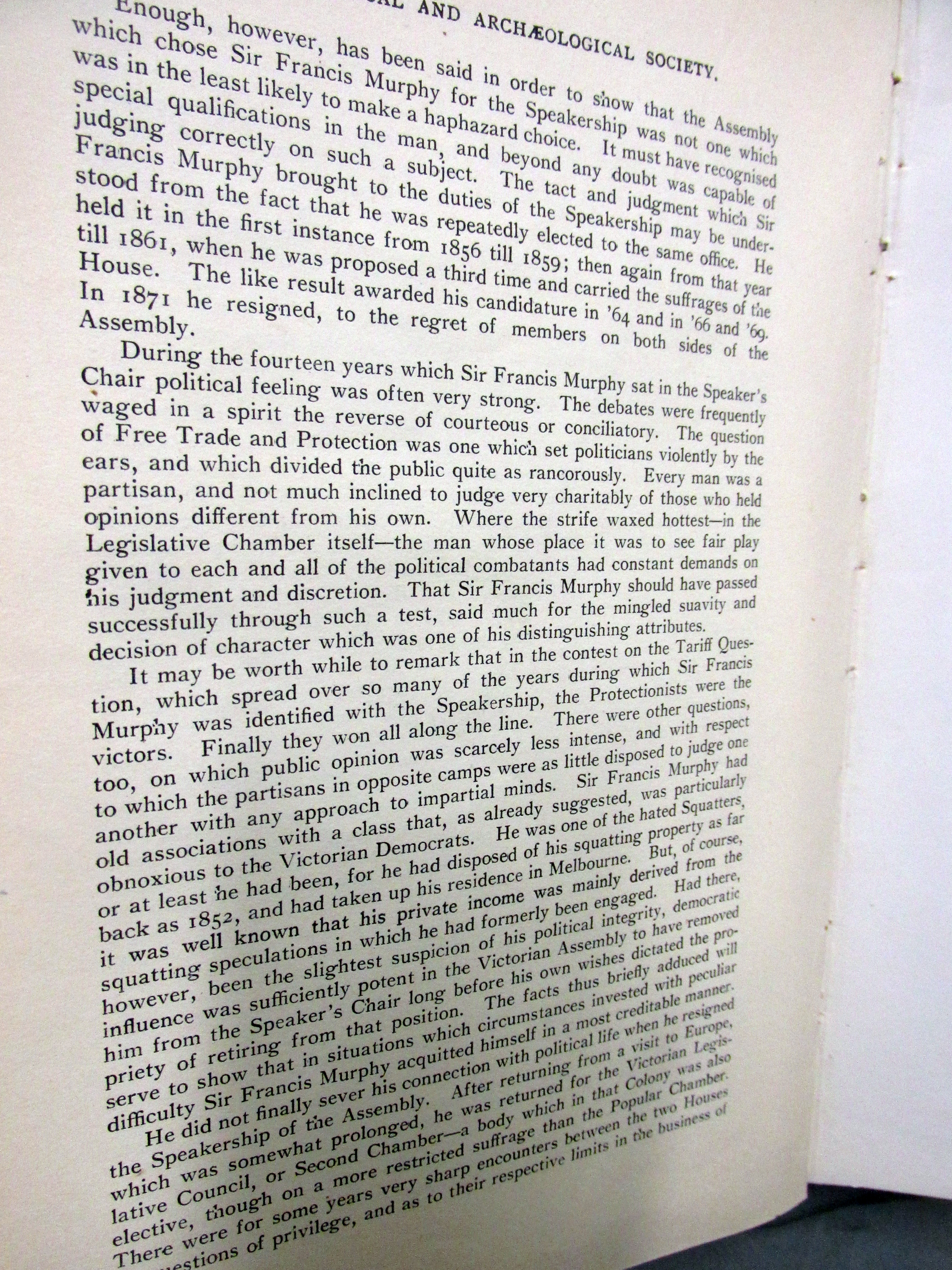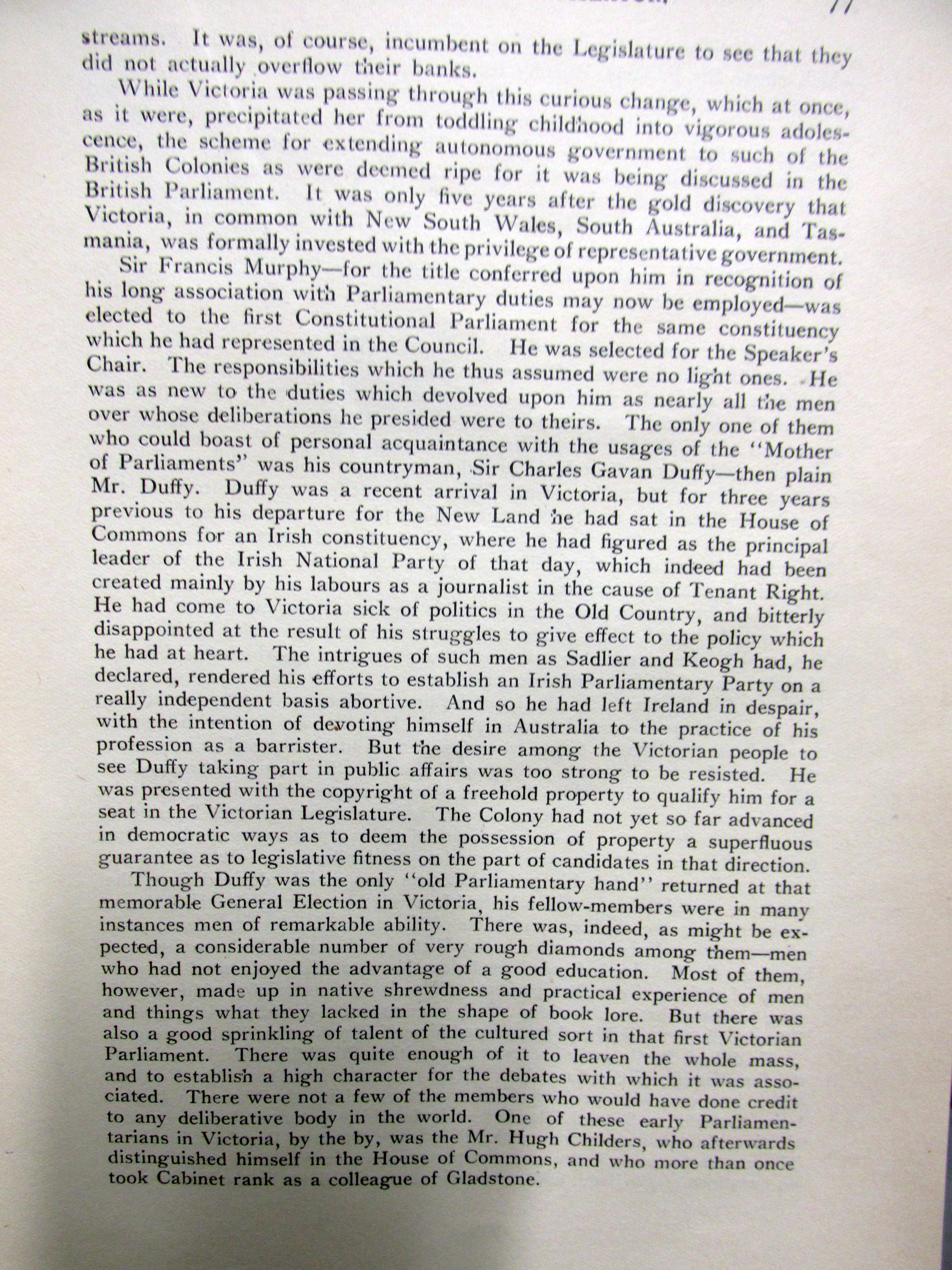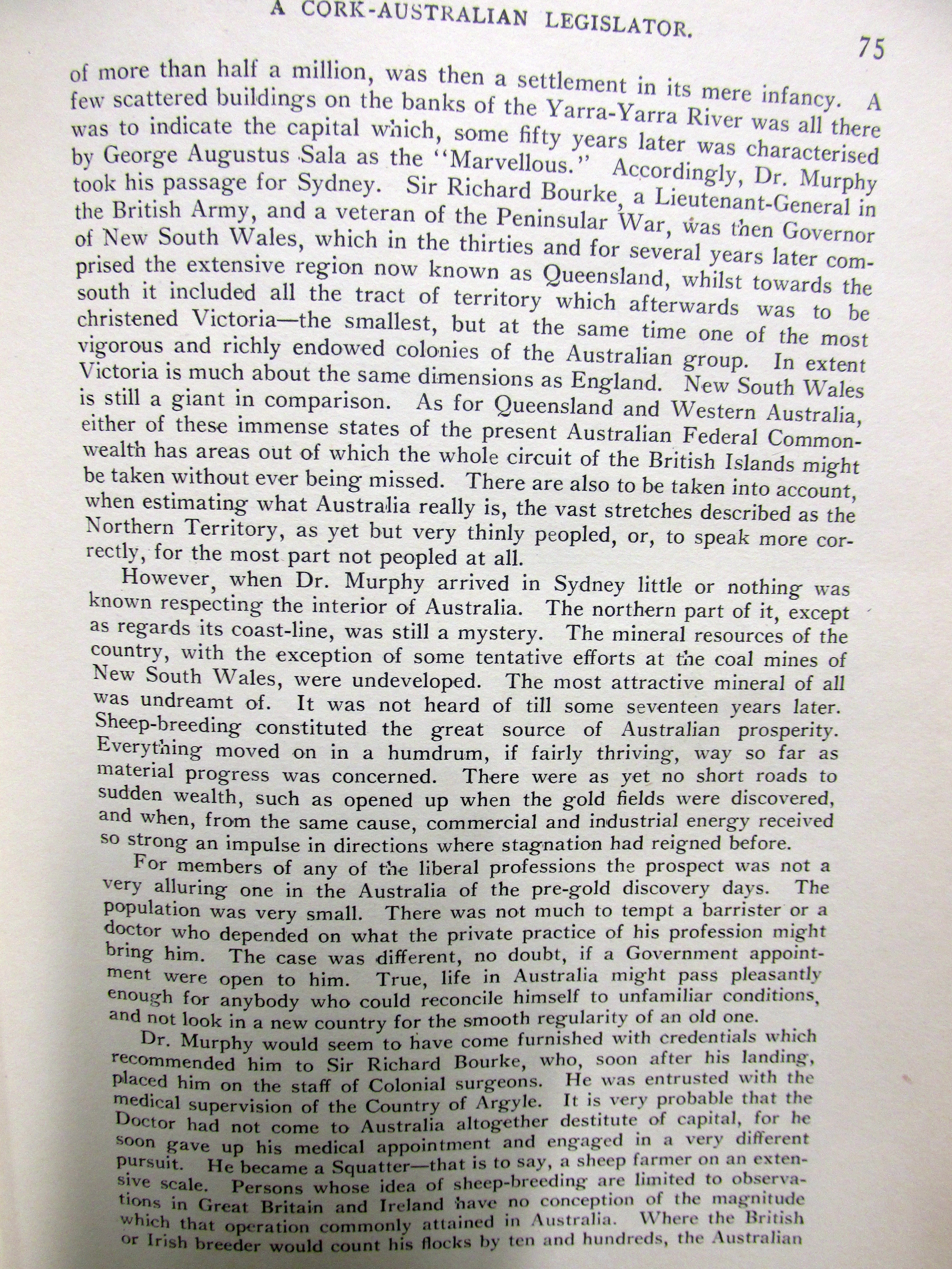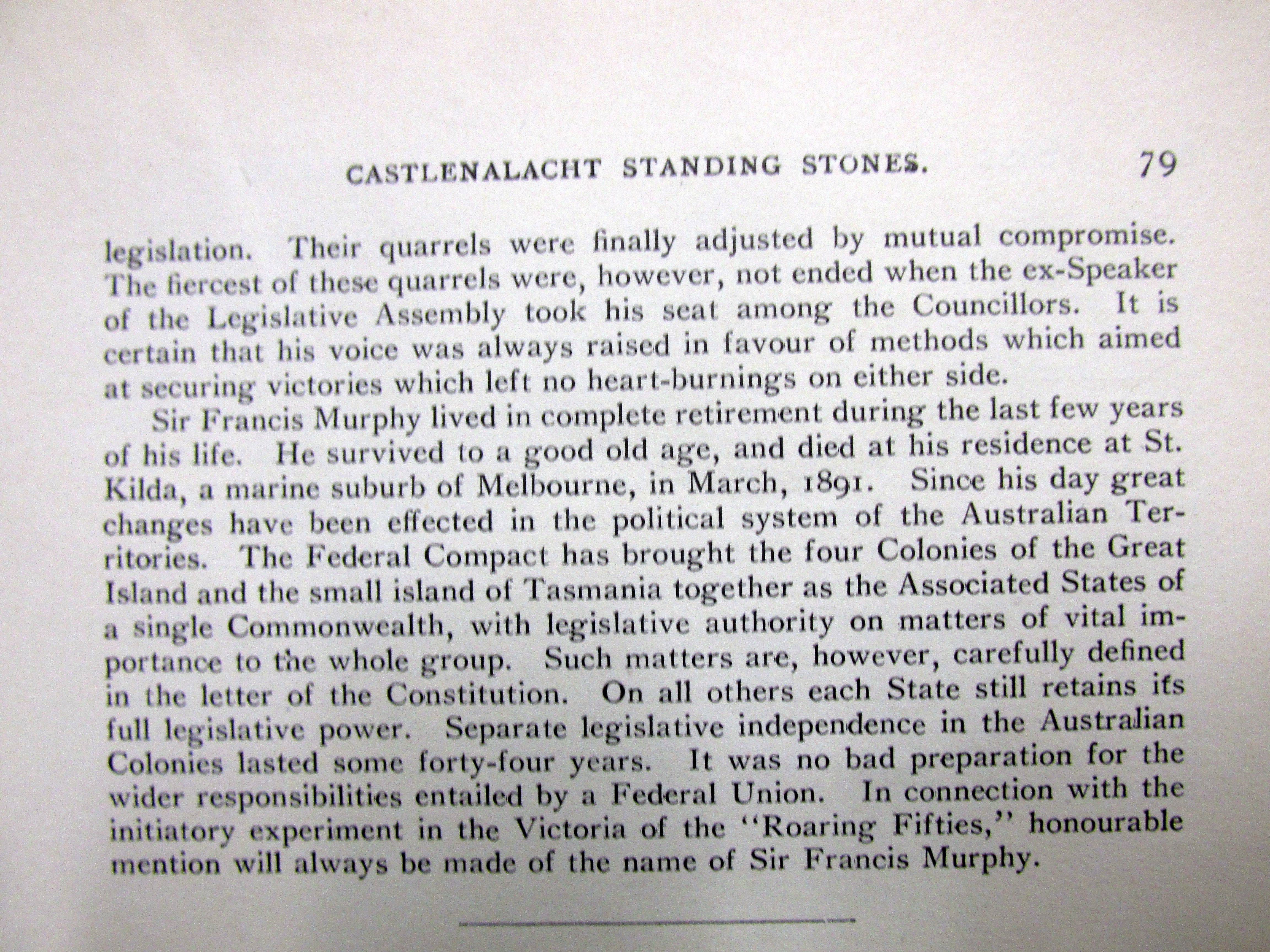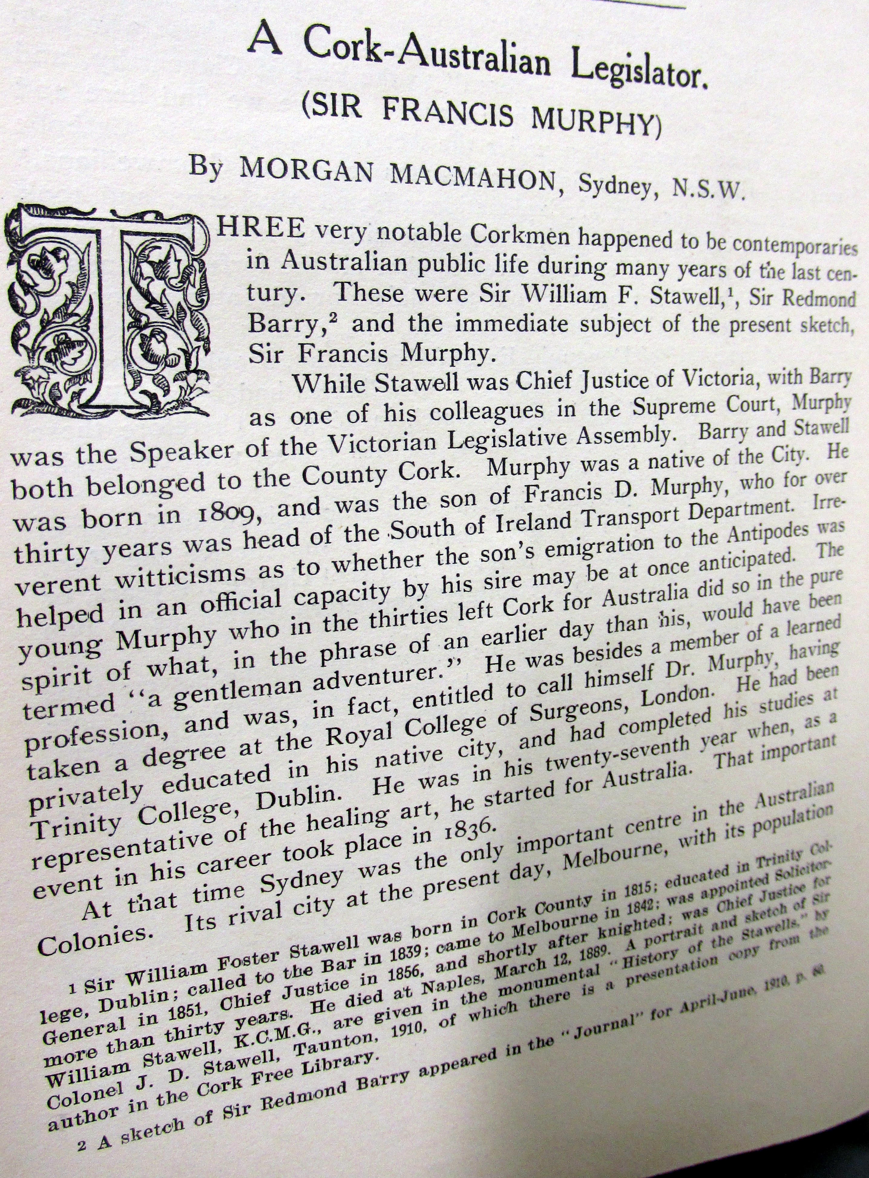 Sir Wiliam Foster Stawell, Co. Cork, to Solicitor General Victoria and Chief Justice 30 years, Sir Francis Murphy, Cork to Military Surgeon and Speaker Victoria Parliament, Australia.  Stawell footnote on bottom of page 1.